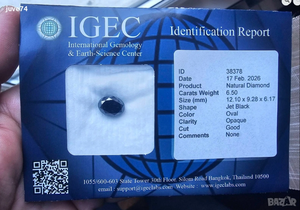 ИЗУМИТЕЛЕН ЕСТЕСТВЕН ЧЕРЕН ДИАМАНТ. НЕТРЕТИРАН НЕНАГРЯВАН . СЕРТИФИКАТ !!! ТЕГЛО-6.50 кт. РАЗМЕР-12.10х9.28 мм. ОБРАБОТКА-ОВАЛ ФАСЕТ. ЦЕНА-800 евро.