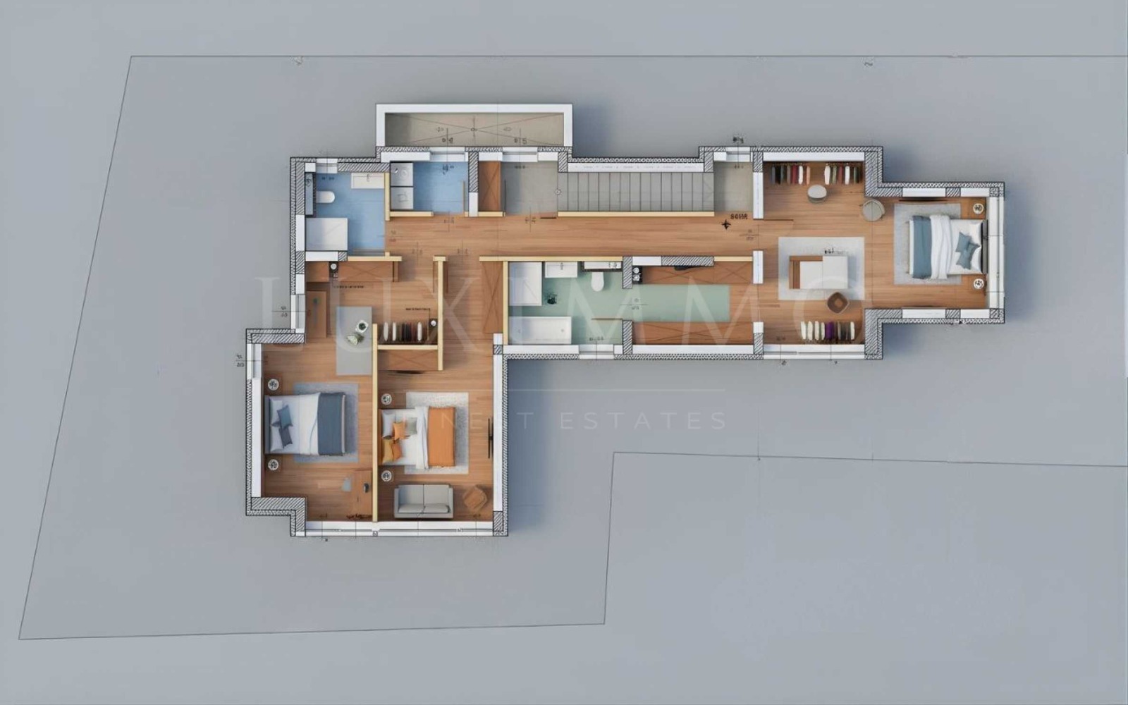 Втори етаж жилищна зона с три много просторни спални (18.76м², 22.35м², 25.39м²), гардеробна, две бани и перално помещение. Разпределението е функционално и осигурява комфорт и уединение за семейството.