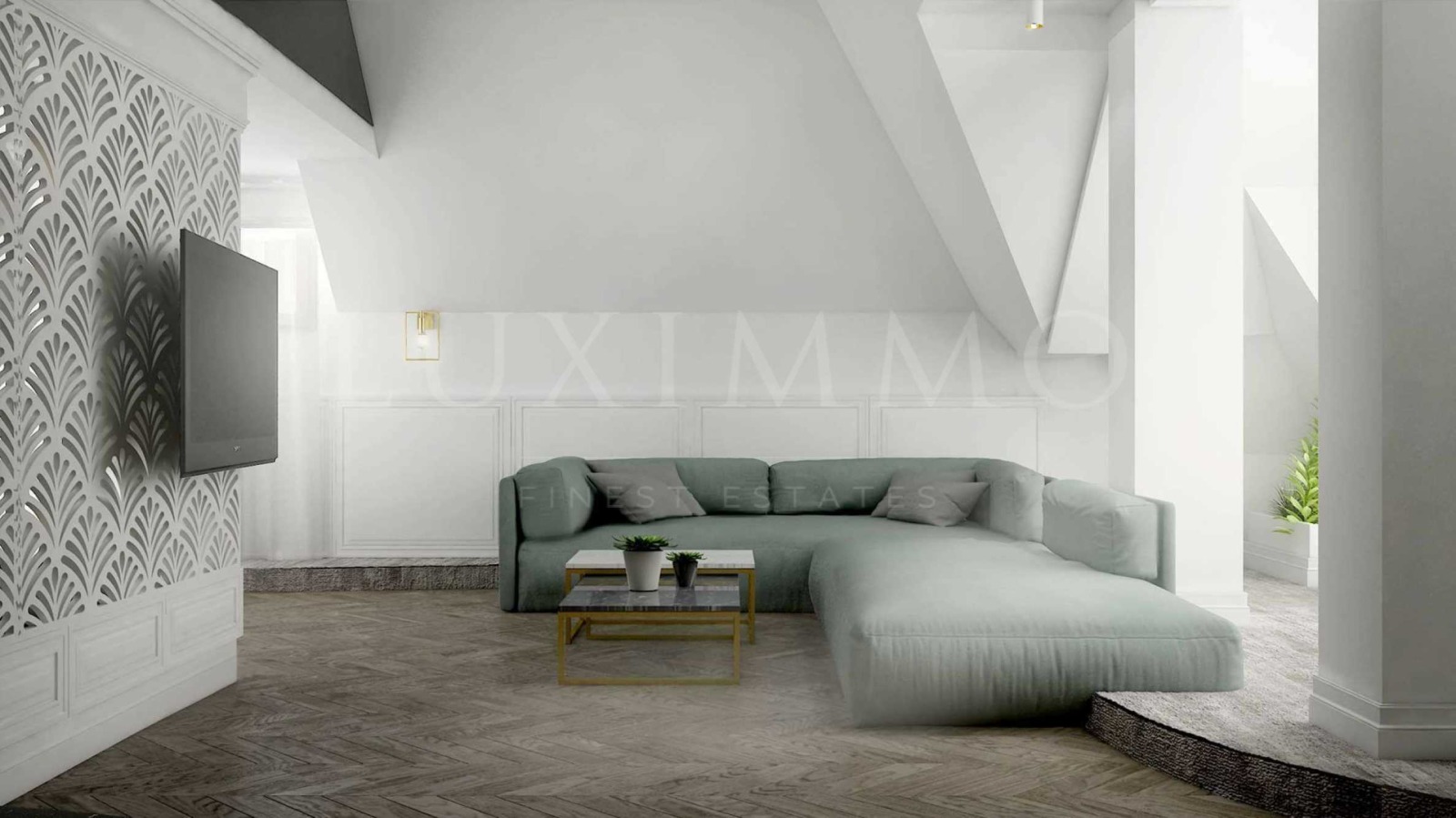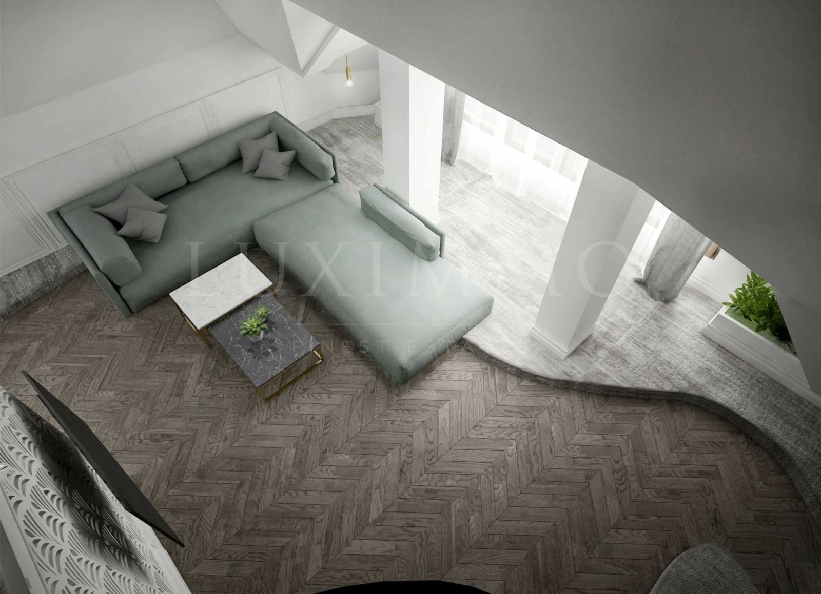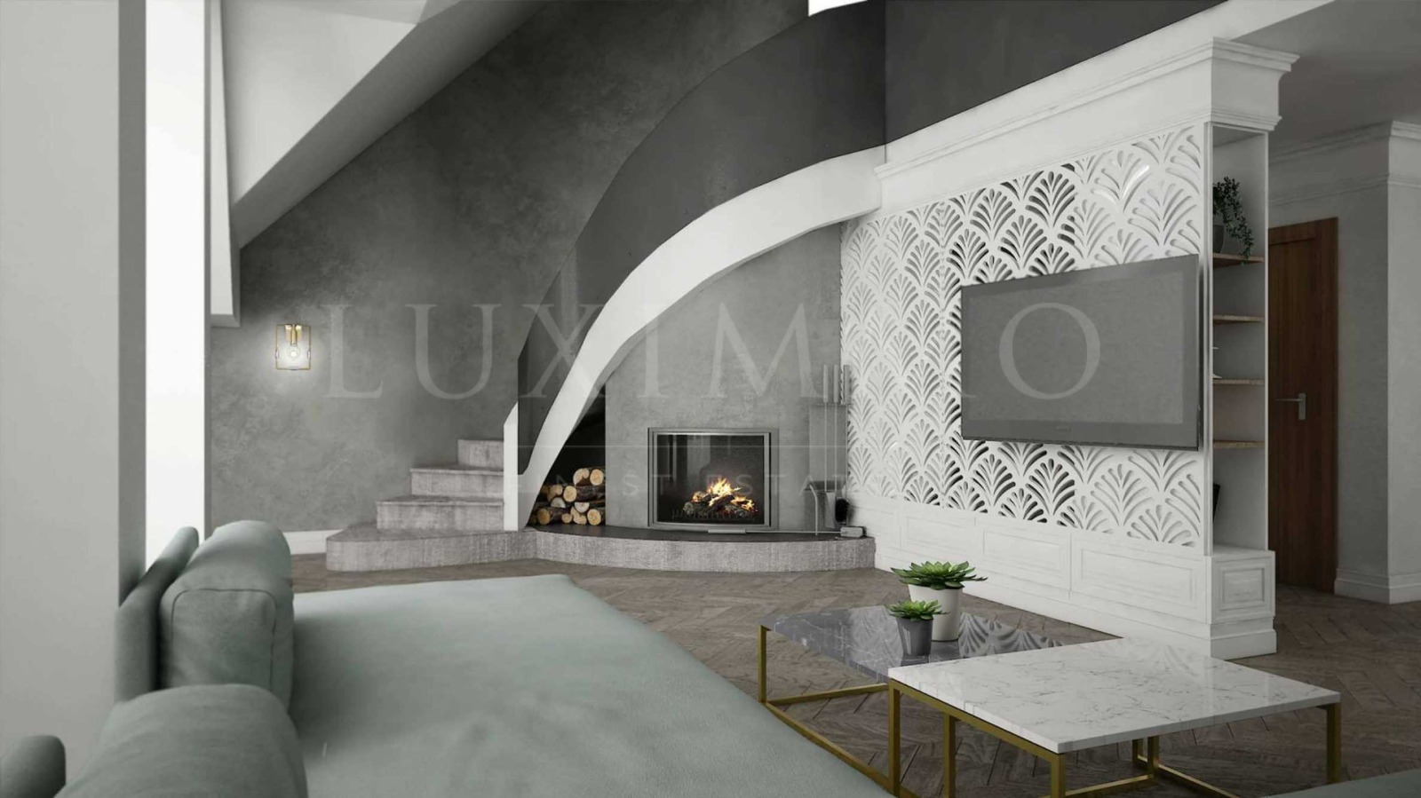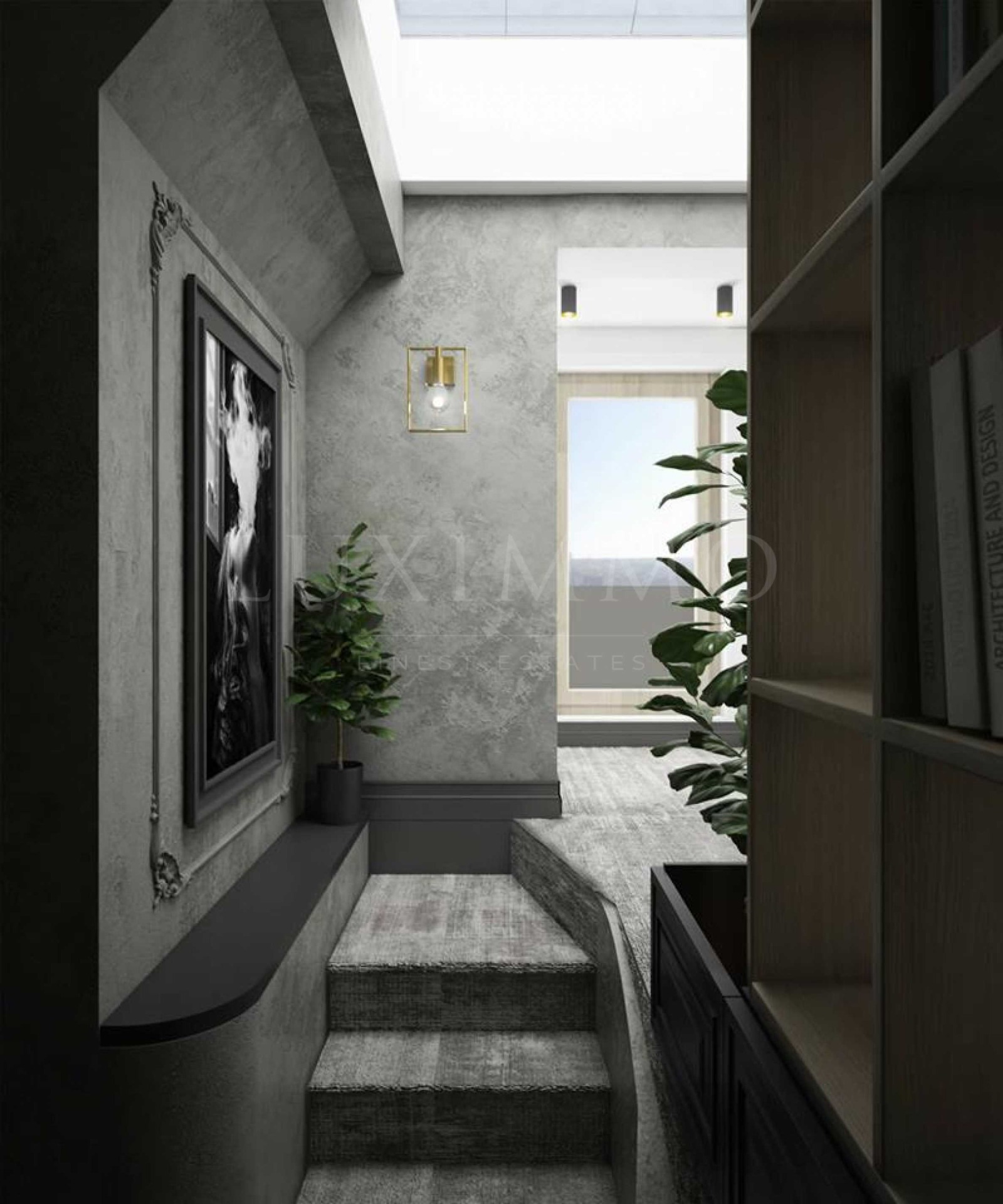 Първият етаж на просторното жилище включва всекидневна с кухня и тераса баня за гости и складово помещение. На второто ниво са разположени три спални, малка гардеробна, голяма баня с тоалетна , уютна тераса и кът за релакс с камина. На последното ниво откриваме стая, специално пригодена за домашен офис и голяма покривна тераса, пресъздадена в лятна градина с красиви градски гледки.