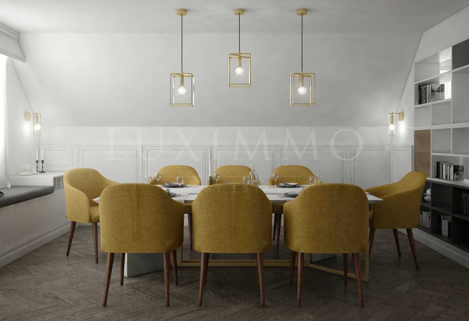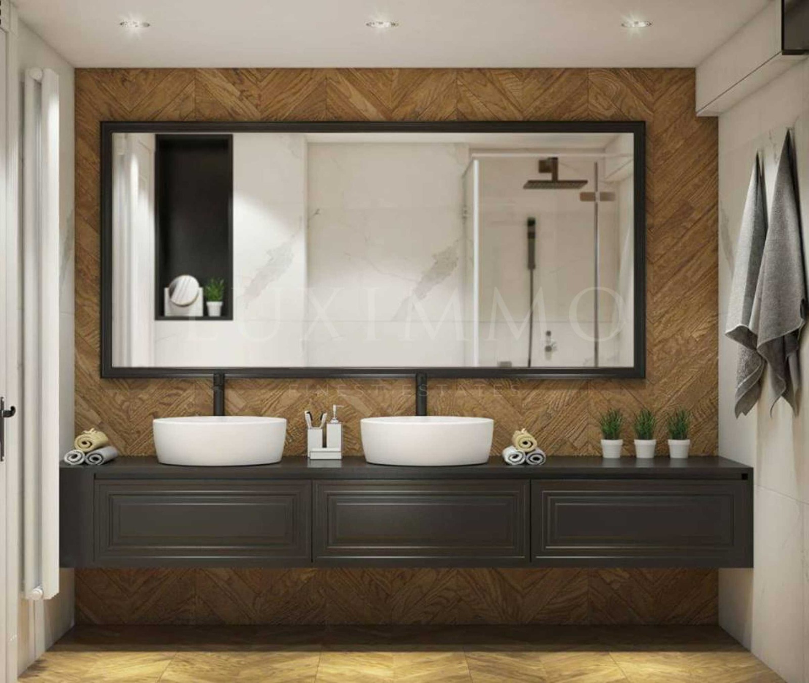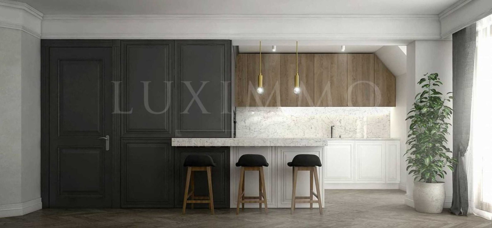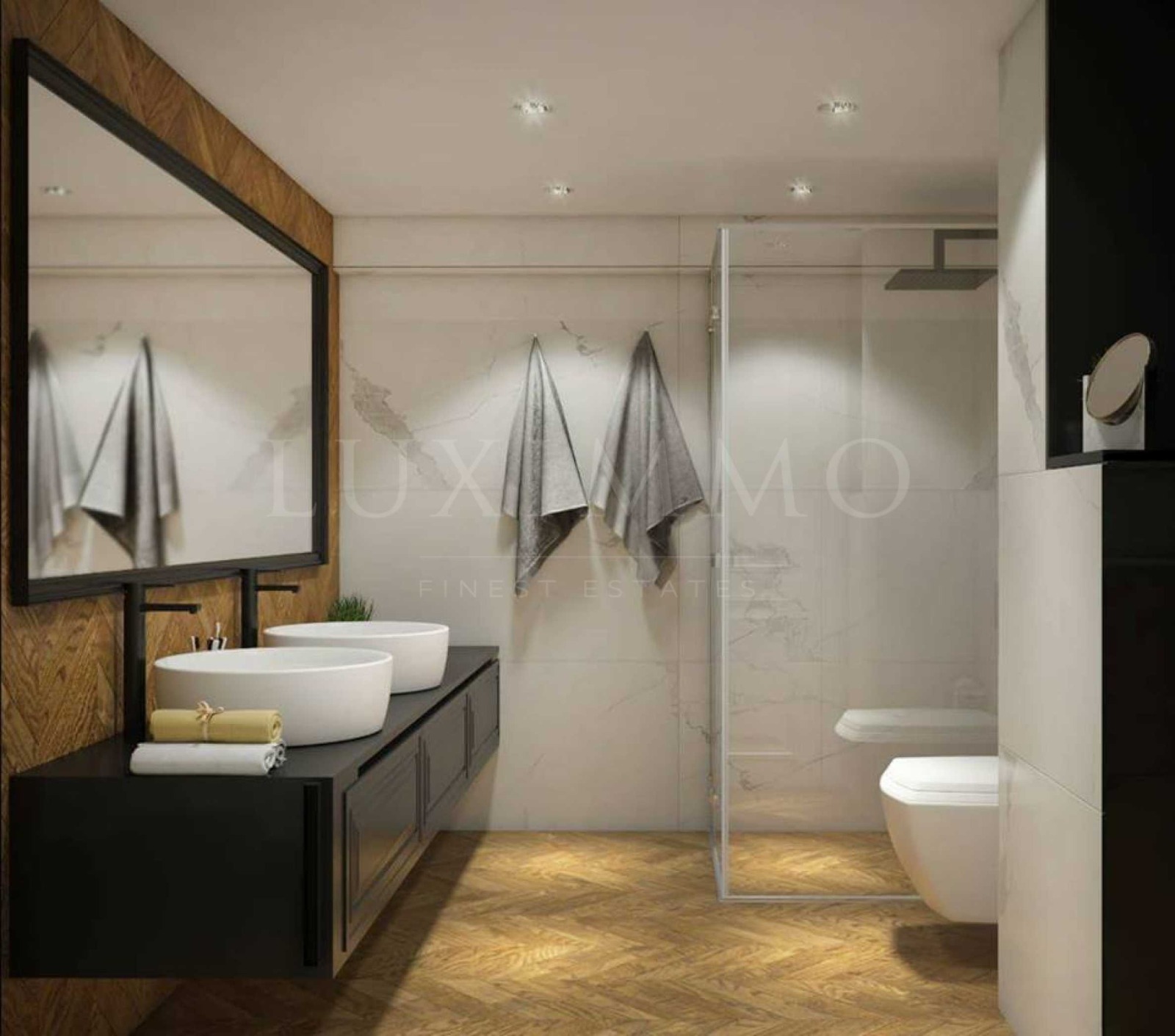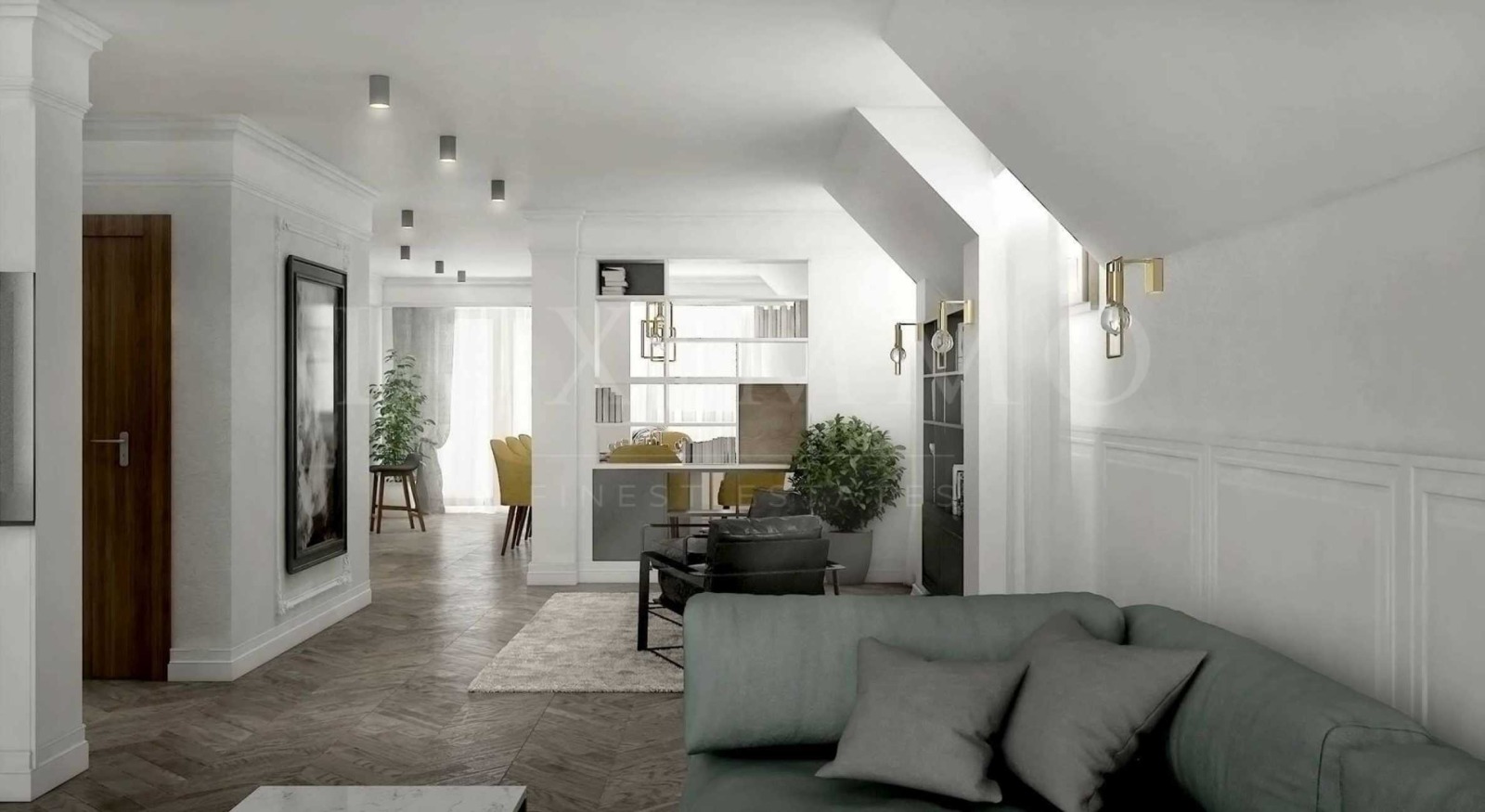 Първият етаж на просторното жилище включва всекидневна с кухня и тераса баня за гости и складово помещение. На второто ниво са разположени три спални, малка гардеробна, голяма баня с тоалетна , уютна тераса и кът за релакс с камина. На последното ниво откриваме стая, специално пригодена за домашен офис и голяма покривна тераса, пресъздадена в лятна градина с красиви градски гледки.