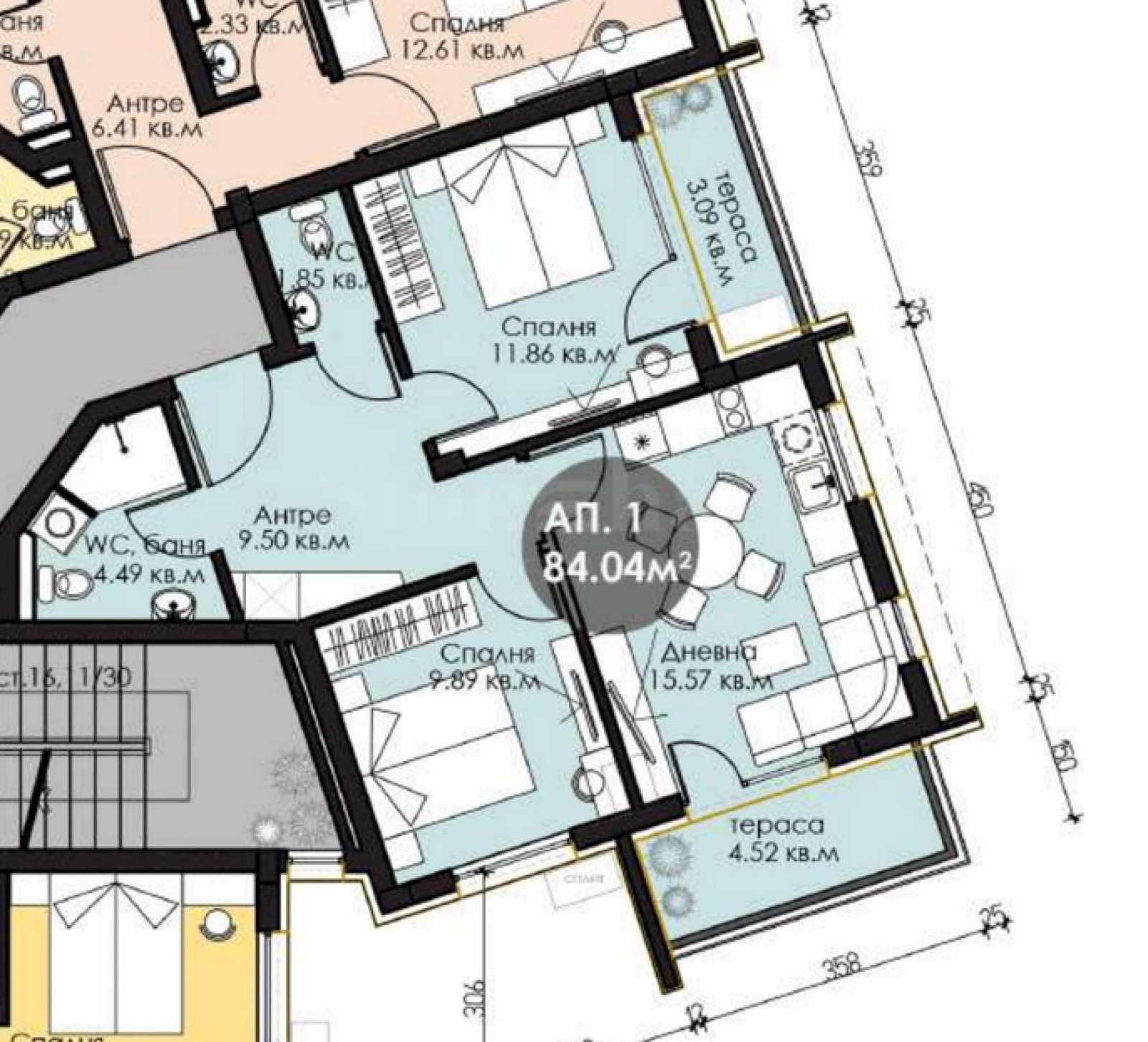 Апартаментът е разположен на първия етаж на сградата и е с площ от 84.04 кв.м. Жилището се отличава с прозорци от пода до тавана елемент, типичен за имоти от високия и ултралуксозния клас, който допринася за усещането за простор, светлина и свобода.