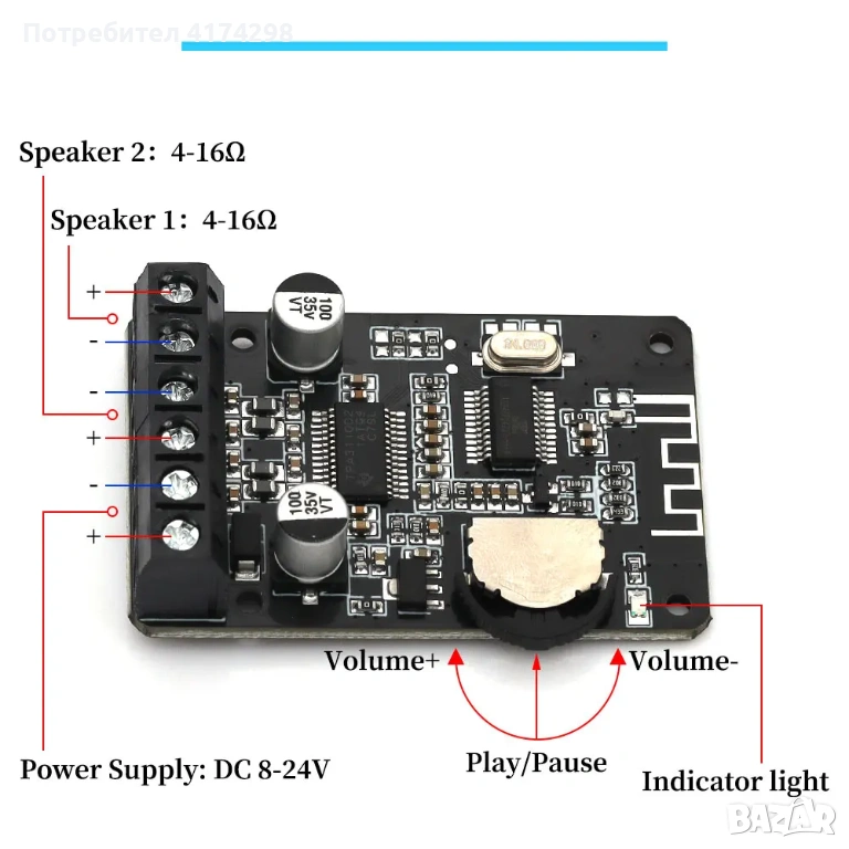 The Bluetooth audio amplifier board input voltage range is DC 8-24V. Current input: 2A or above. NOTE: Input voltage must no more than 26V, otherwise the audio amplifier module will be damaged.
