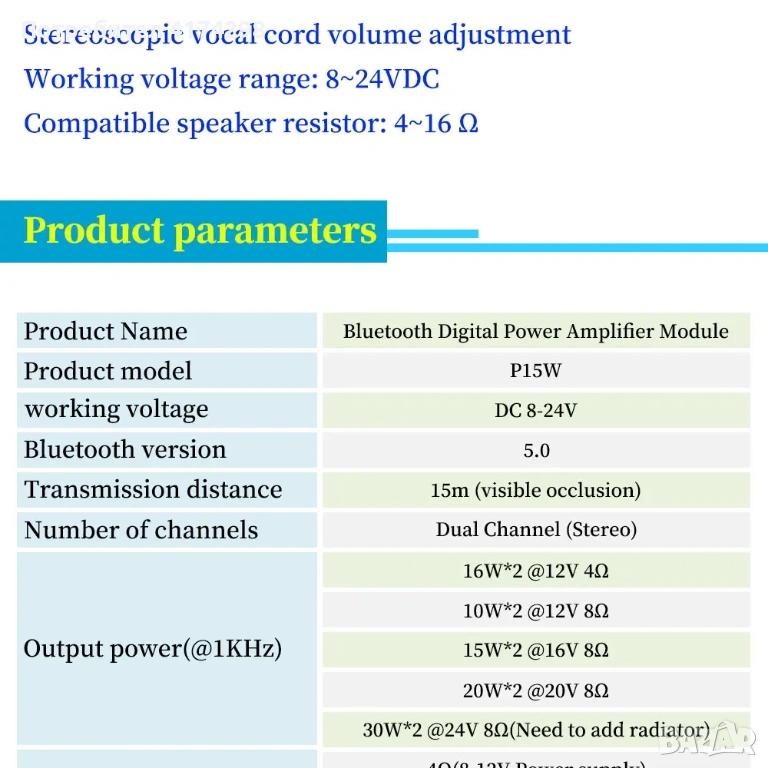 Two channels 10W/15W/20W amplifier board work with various speakers (4-16 ohm), supporting Bluetooth stereo audio input.