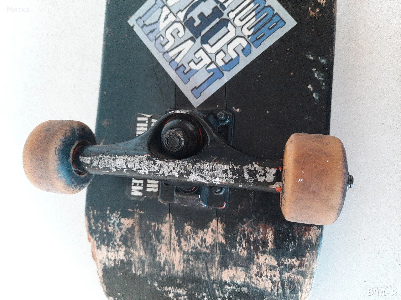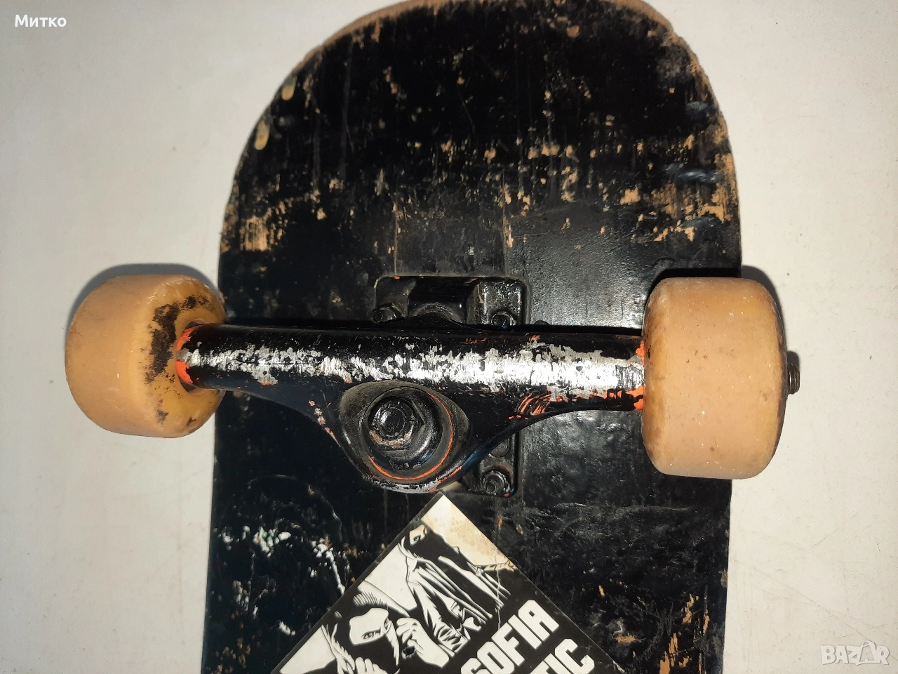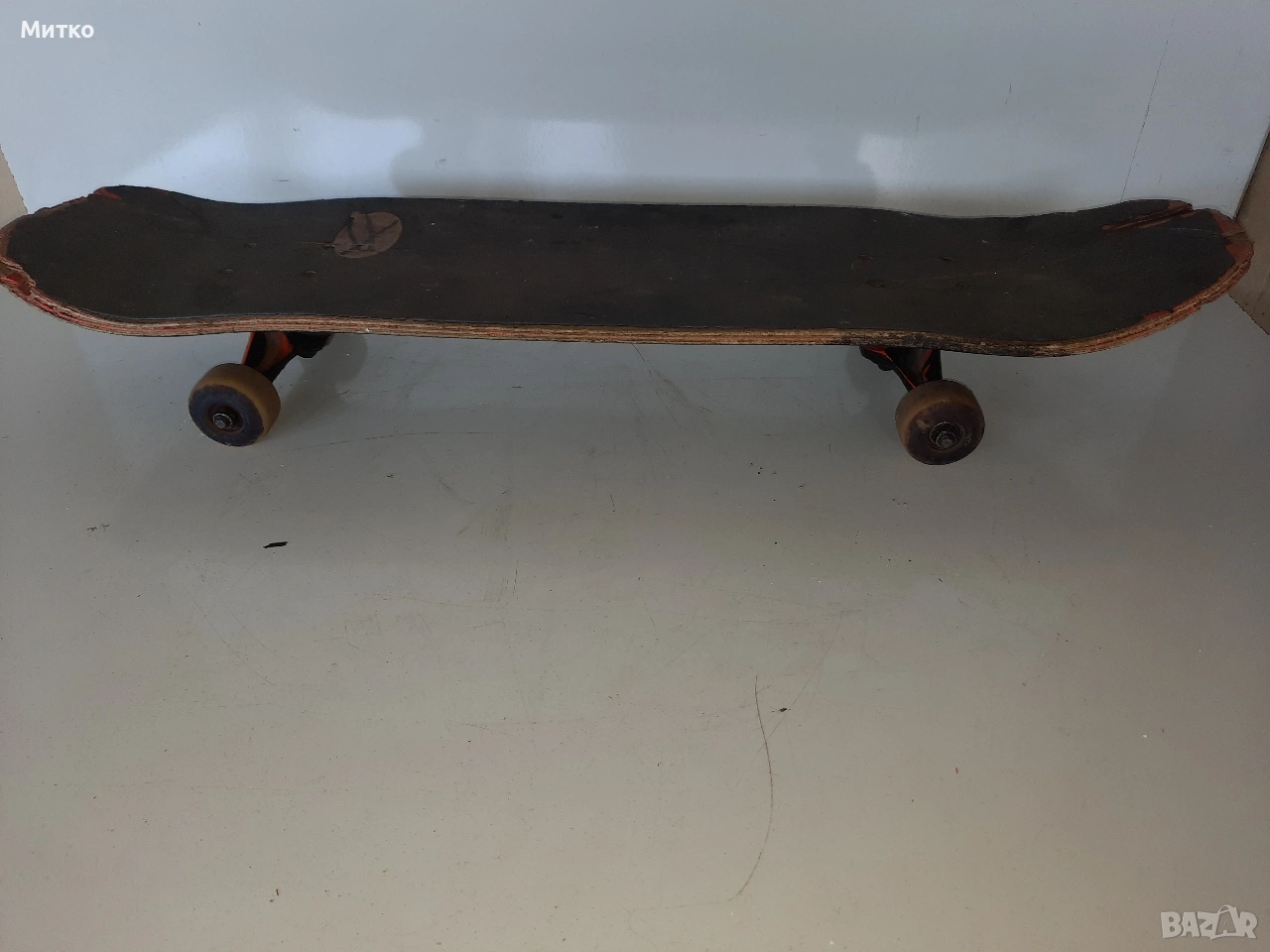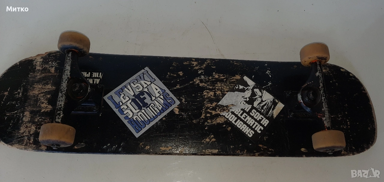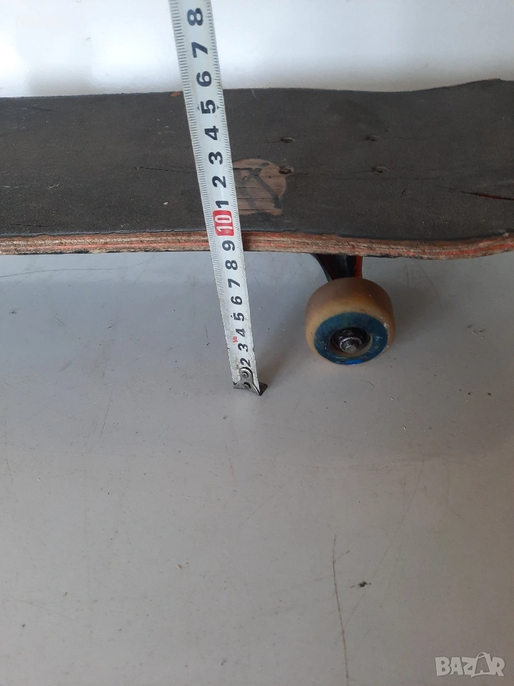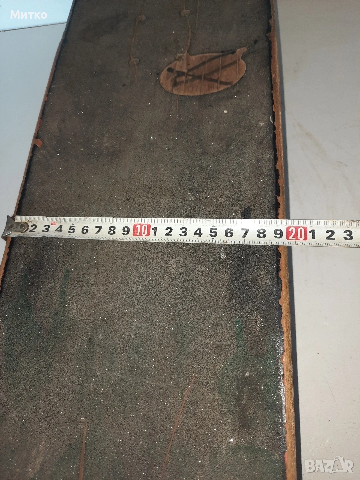 Скейтборд с дребни забележки. Размери ширина 20см.Дължина 76см височина 10см Като цяло е здрав с работещи колелета Ина само малки отчупвания на дървото от предната и задната част на дъската.колелцата със стойките са Полирани MID скейтборд камиони на Independent Truck Co.