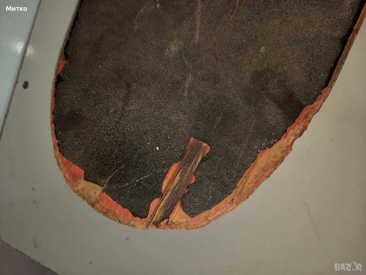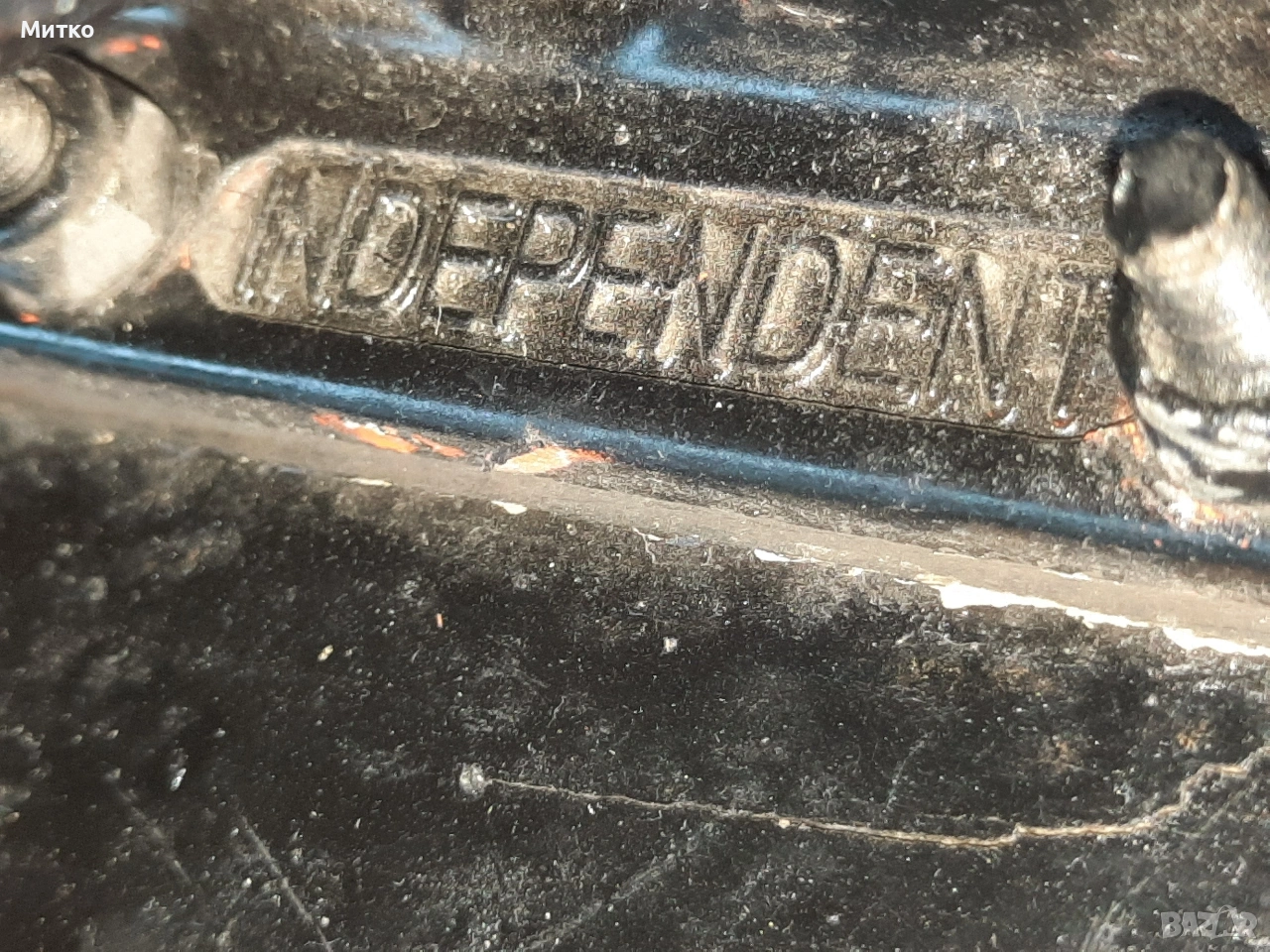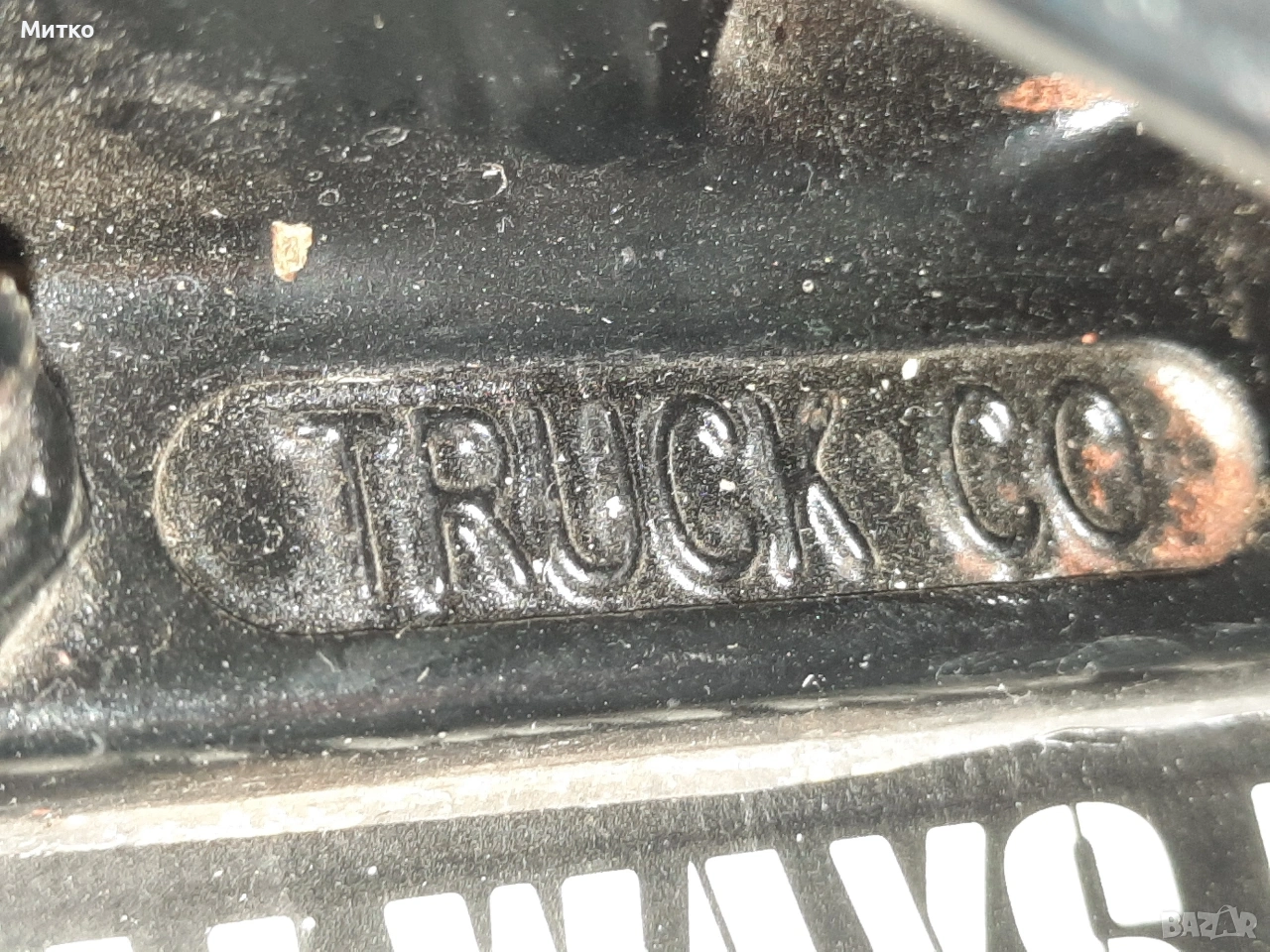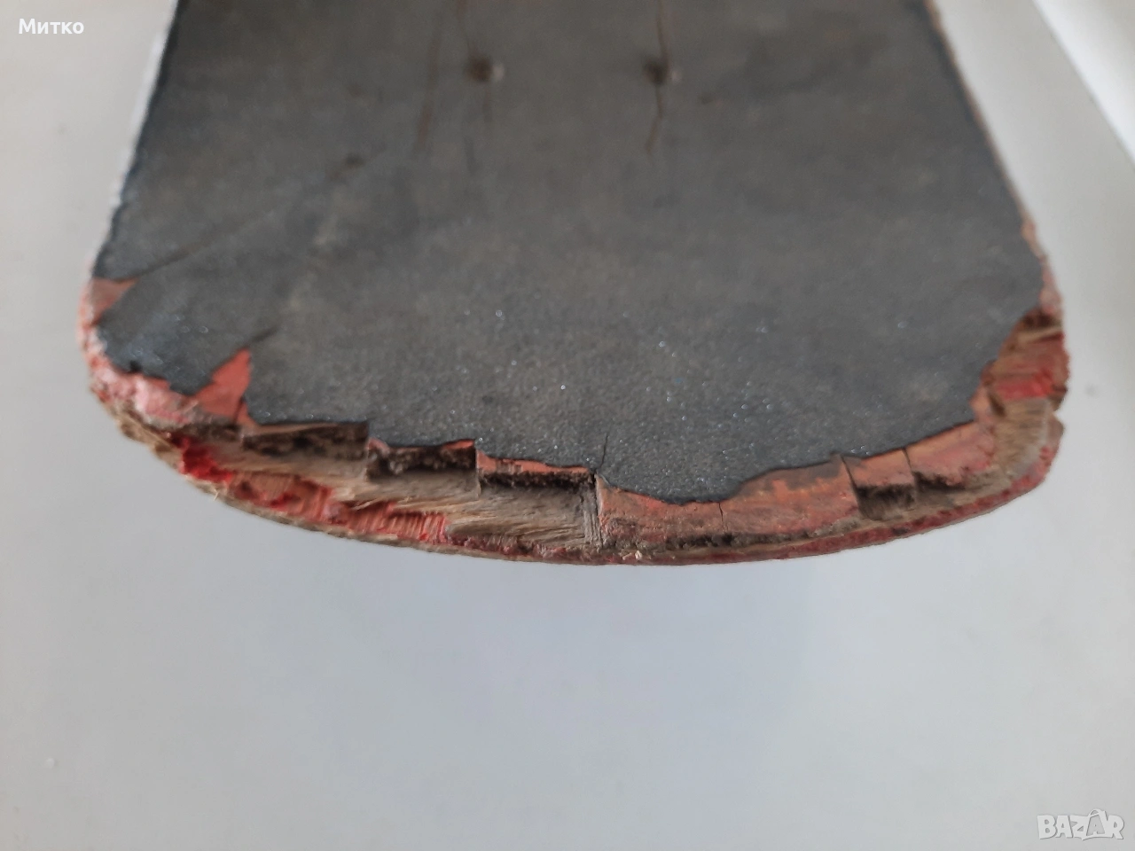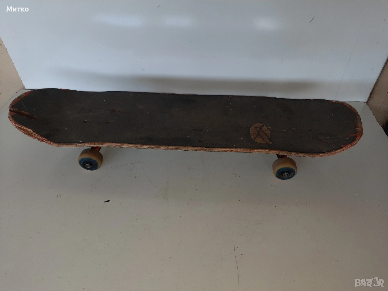 Скейтборд с дребни забележки. Размери ширина 20см.Дължина 76см височина 10см Като цяло е здрав с работещи колелета Ина само малки отчупвания на дървото от предната и задната част на дъската.колелцата със стойките са Полирани MID скейтборд камиони на Independent Truck Co.