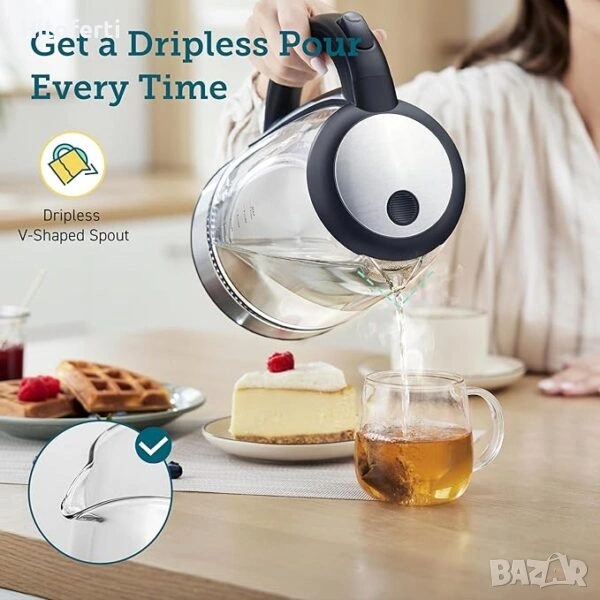 • НУЛЕВ КОНТАКТ С ПЛАСТМАСА – Изработена от висококачествено боросиликатно стъкло и вътрешен капак и филтър от неръждаема стомана 304, електрическата кана за чай гарантира безопасността и чистотата на вашата вода.