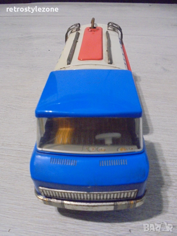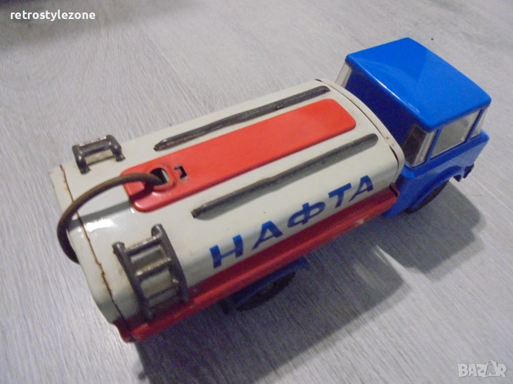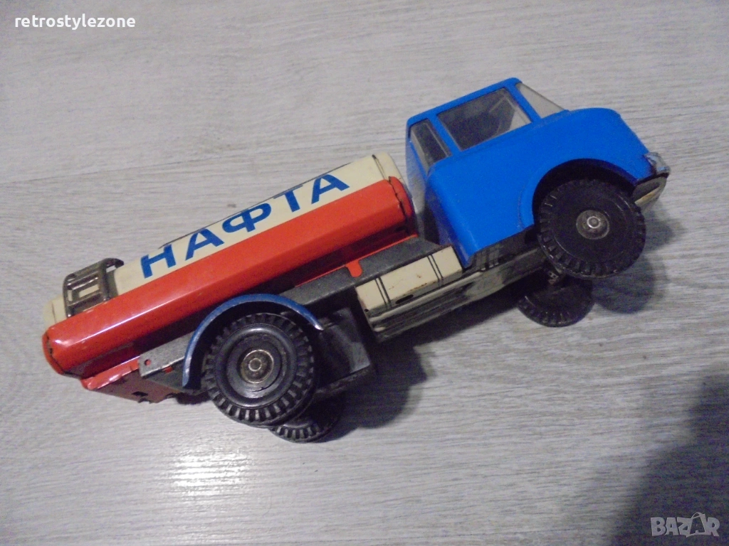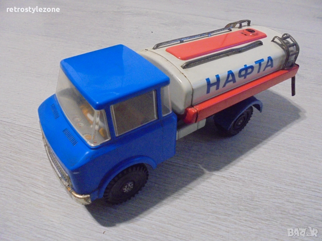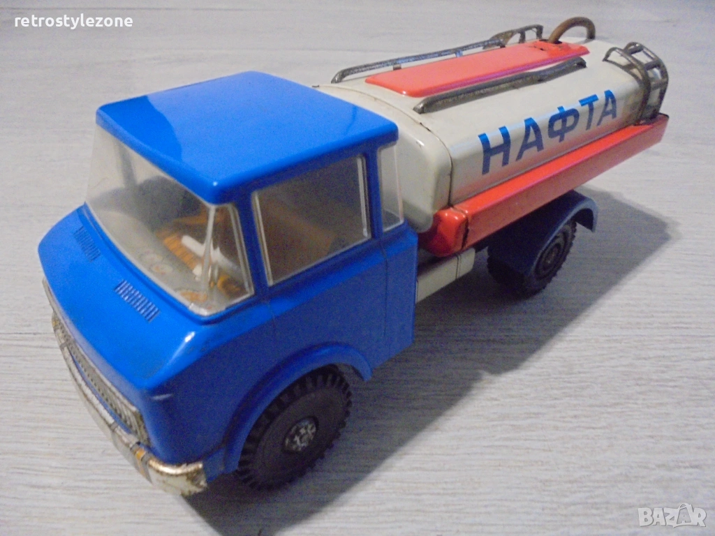 Оригинална винтидж детска играчка – камион цистерна „НАФТА“, характерен модел от индустриалния дизайн на социалистическата епоха (1970-те – 1980-те години). Подобни играчки са произвеждани в ограничени серии в страните от Източна Европа и днес са все по-търсени от колекционери на ретро играчки и социалистически предмети.