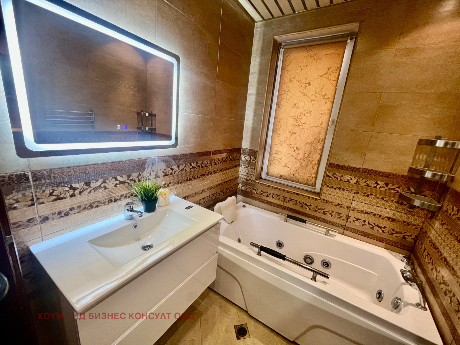 Апартамента е със следното разпределение - коридор с голям гардероб с пералня и шкаф ча обувки; баня с хидро масажна вана и тоалетна; кухненски бокс - напълно оборудван, и трапезна маса с 4 бр. столове; хол с голям диван, холна маса и телевизор; спалня с гардероб и скрин; тераса с излаз от двете помещения.