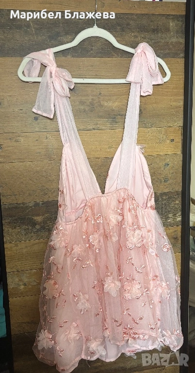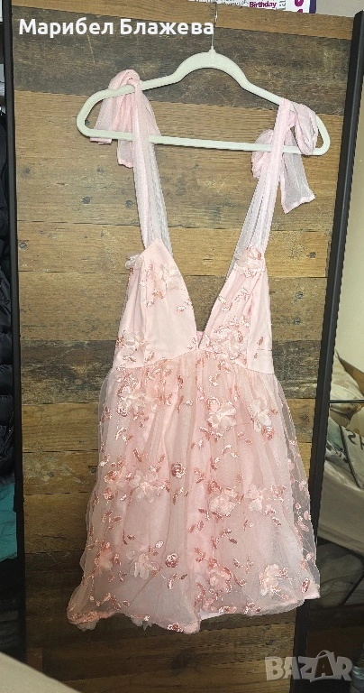 Розовата рокля не е използвана и е купувана за повод. Купувана е от сайт и размерът е М, но като номер може би е 38.