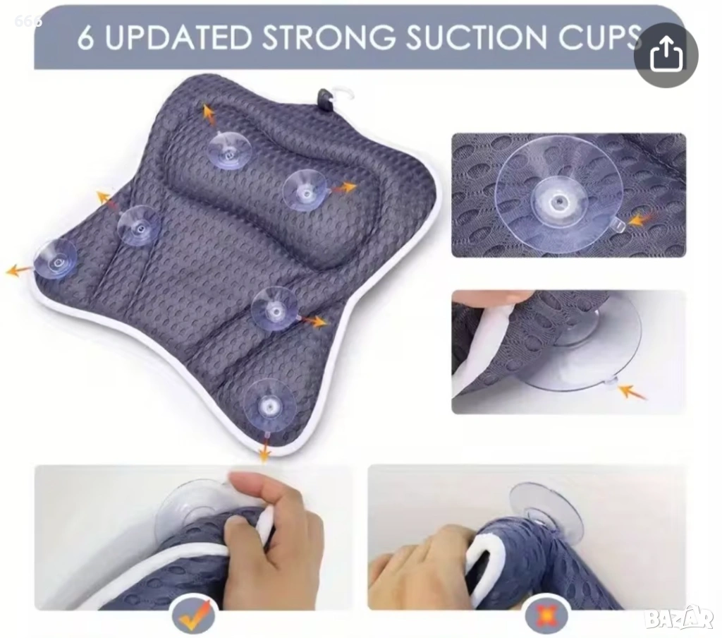 6 мощни вендузи: С шест изключително големи вакуумни вендузи, нашите възглавници за вана за глава и врата предлагат несравнима стабилност, предотвратявайки подхлъзване или плъзгане по време на употреба. Отстраняването е лесно, благодарение на отделните езичета, прикрепени към всяка вендуза. Можете да разчитате на тези мощни вендузи, за да държат възглавницата за вана здраво на място, без риск от откачане.