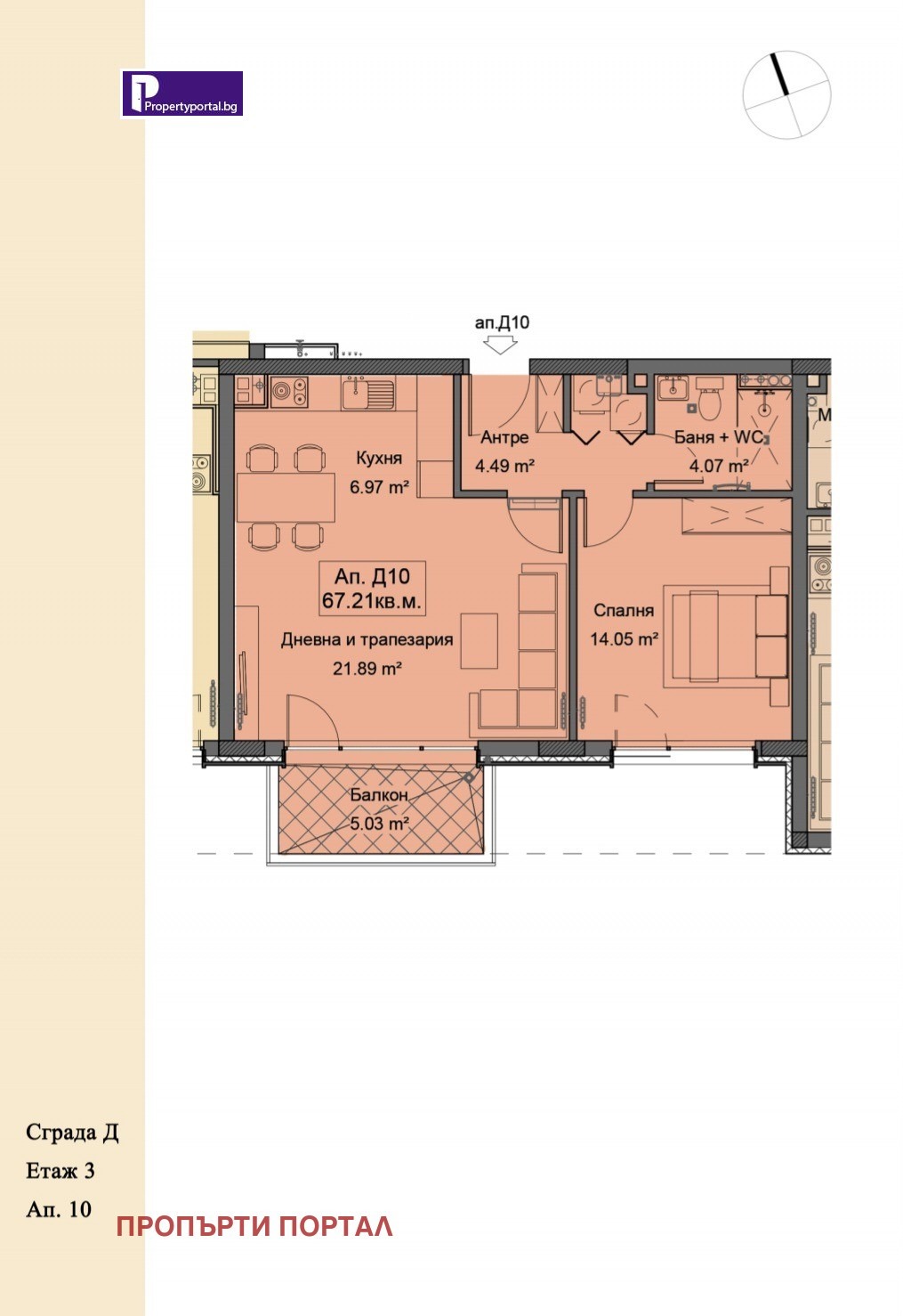 🔹 Разпределение: антре, просторен хол с кухненски бокс, спалня, баня, мокро помещение и тераса.