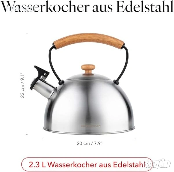 - Подходяща за всички кухни. Каната е подходяща за всички видове котлони: индукционни, стъклокерамични, газови или електрически. Дизайнът на дървената дръжка ѝ придава стил и изтънченост.