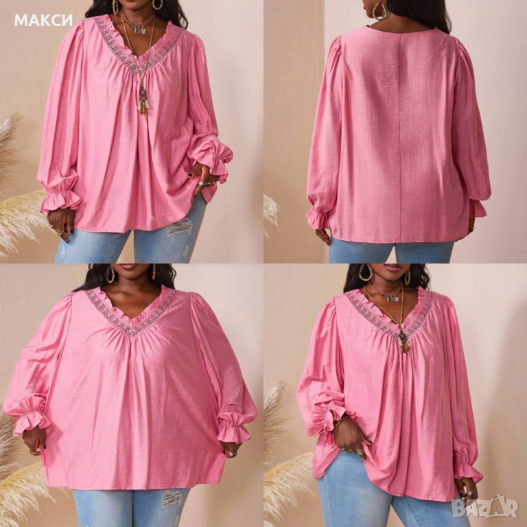 Красива макси бонбонено розова блуза с приказен дантелен кант деколте+ къдрички с ефектни широки дъл → Обява 53787650