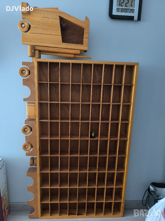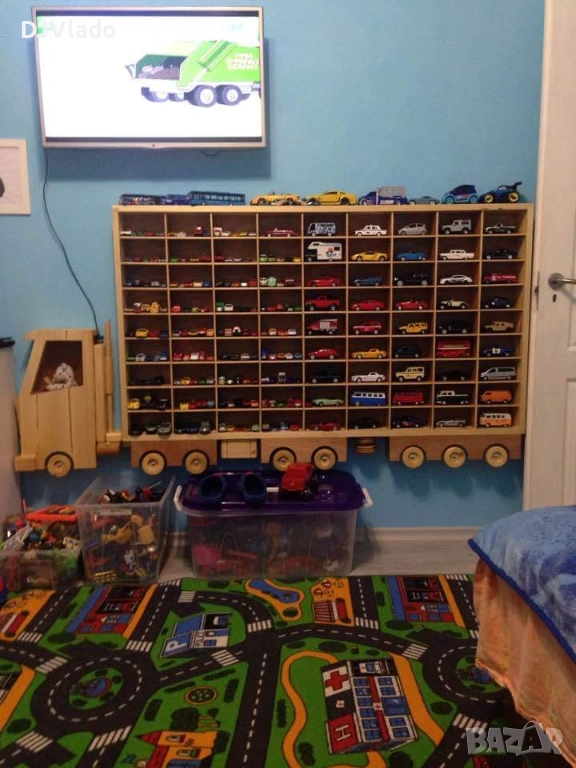 Продавам Уникат дървен камион етажерка за съхранение на колички или други играчки, 81 броя, 9 на 9 реда, размер на кутийките 15 см широка, 9 см дълбока, 8 см висока. Целия размер на камиона е 93 см широк, 181 см дълъг ,12 см дълбочина.