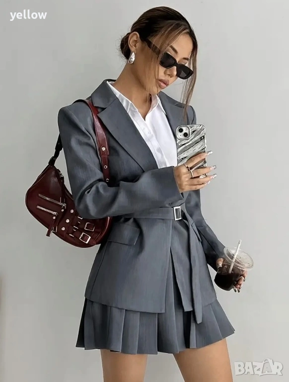 Нов комплект сако с колан и плисирана пола