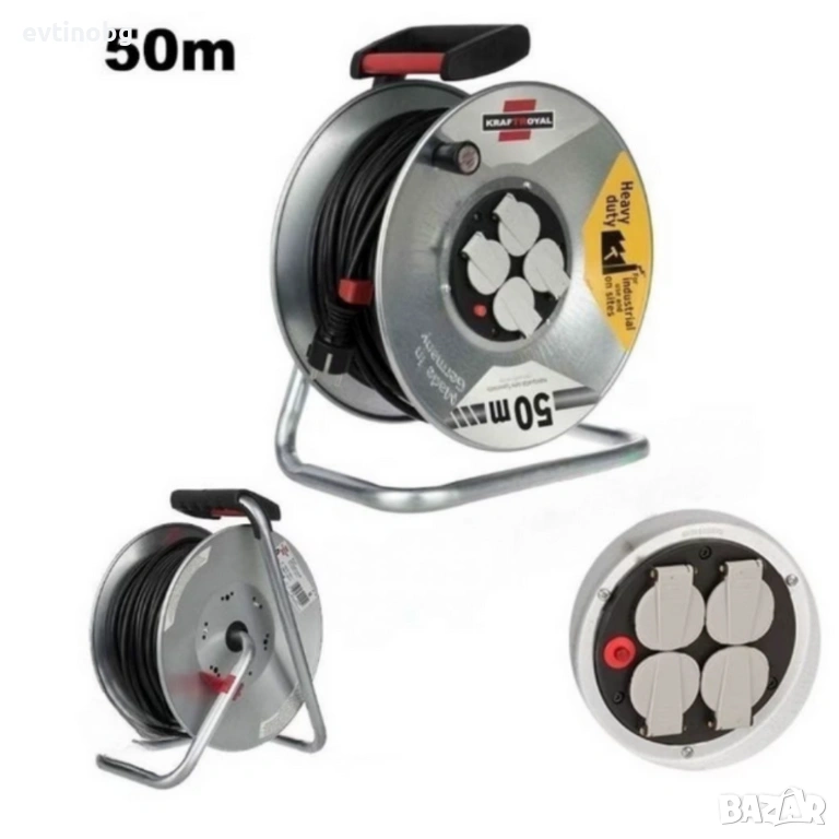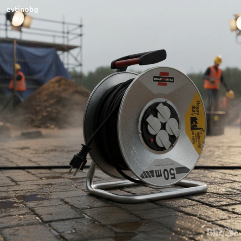 Електрически удължител с макара KraftRoyal 50m — здрава поцинкована конструкция, 4 гнезда и термична