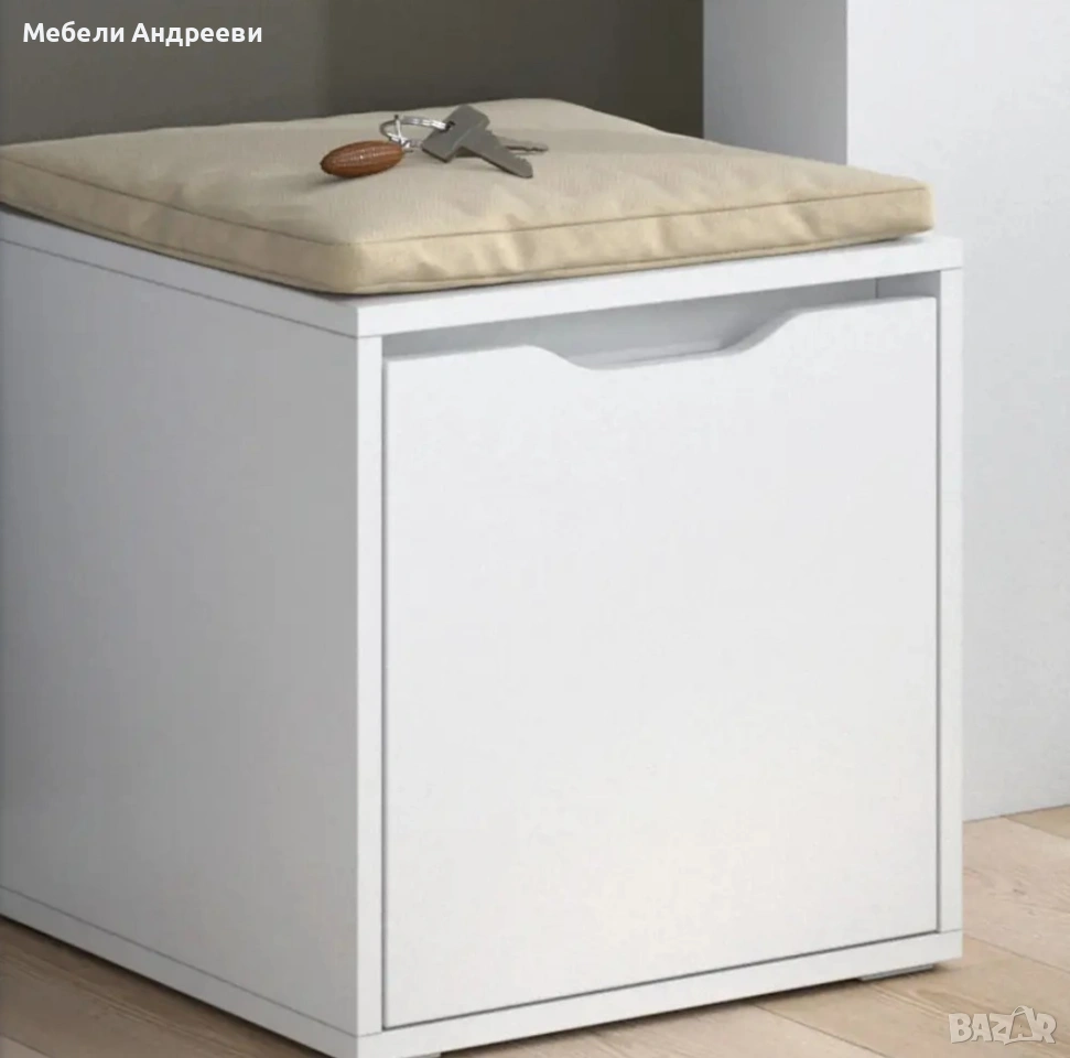 Това шкафче тип табуретка е идеално за коридор или спалня – комбинира място за сядане и скрито пространство за съхранение. Вратата се отваря надолу и е с удобен изрез вместо дръжка. Горната част е с мека възглавница за комфорт. Стои стабилно, не се клати и е подходящо за ежедневно ползване.