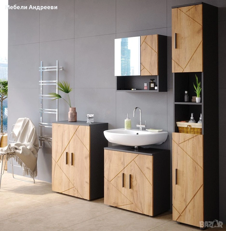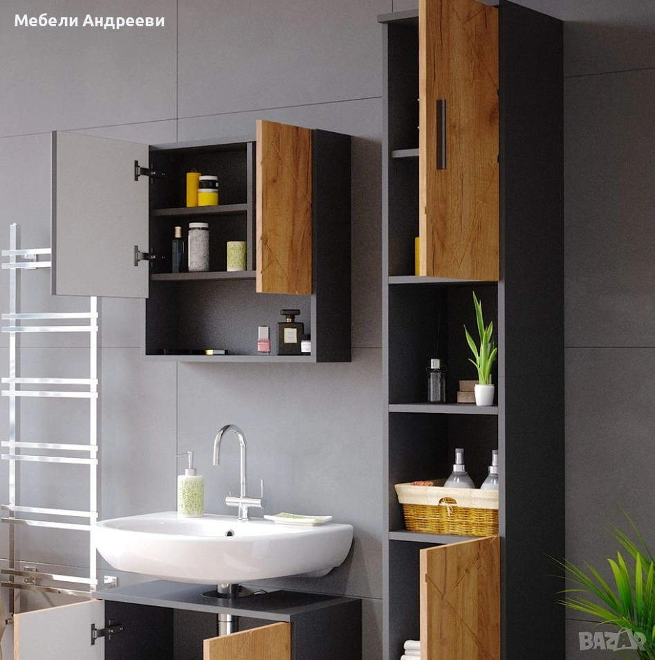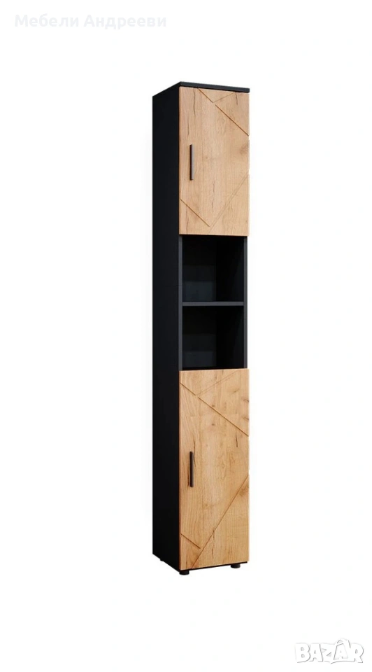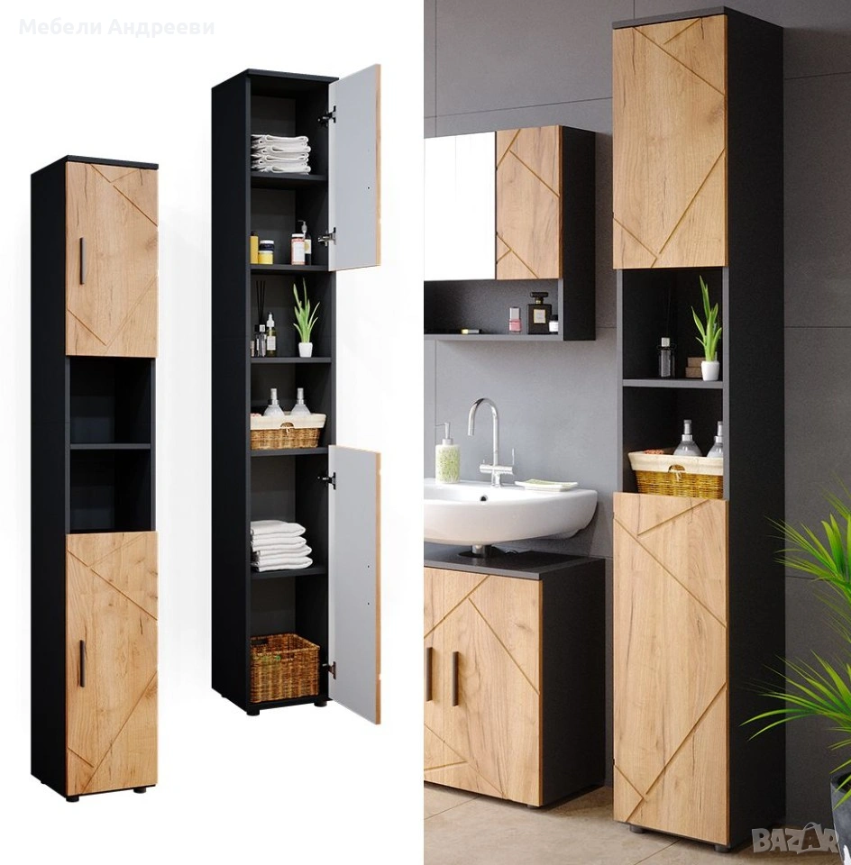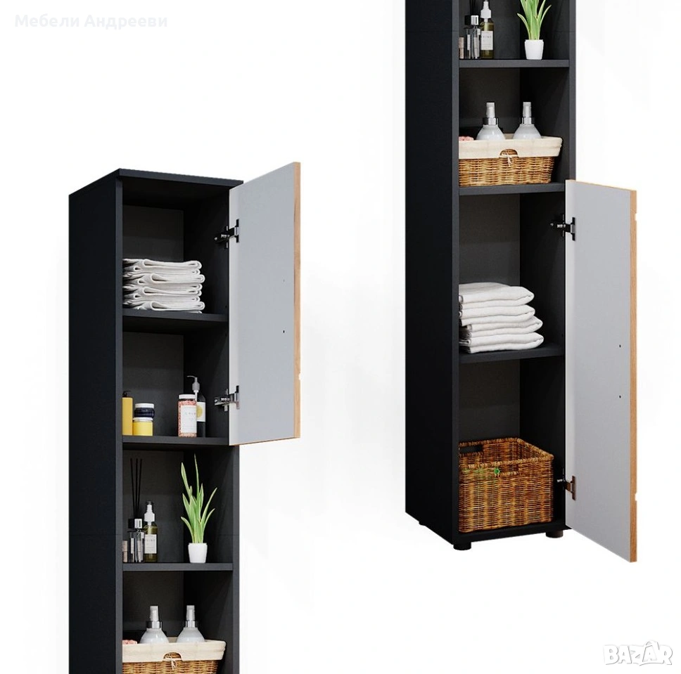 Шкафът е изработен от ПДЧ с меламиново покритие – устойчиво на влага, лесно за почистване и подходящо за ежедневна употреба. Разполага с две вратички и открити рафтове по средата, което осигурява удобна организация и бърз достъп до често използвани вещи. Подходящ е за баня, перално помещение или като висок помощен шкаф. Комбинацията от черен корпус и дървесен декор стои модерно и придава характер на интериора.