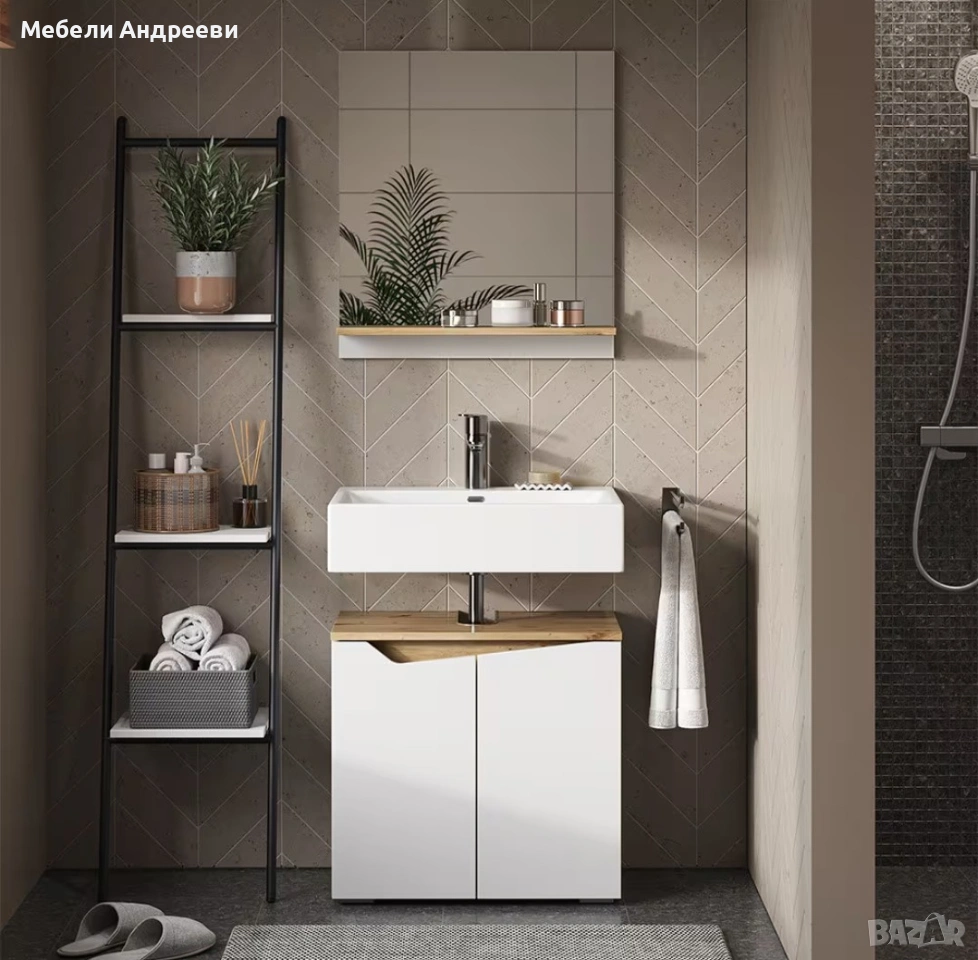 Шкафът е изработен изцяло от ПДЧ с меламиново покритие – подходящо за ежедневна употреба и лесно за поддръжка. Подходящ е за баня, спалня, антре или като помощен шкаф. Цветовата комбинация бяло с дървесен акцент стои модерно и се съчетава лесно с различни интериори.