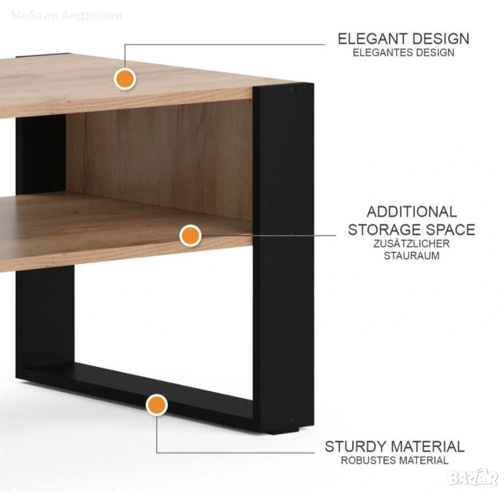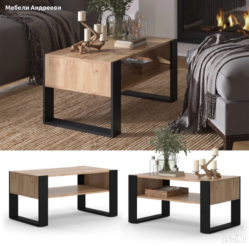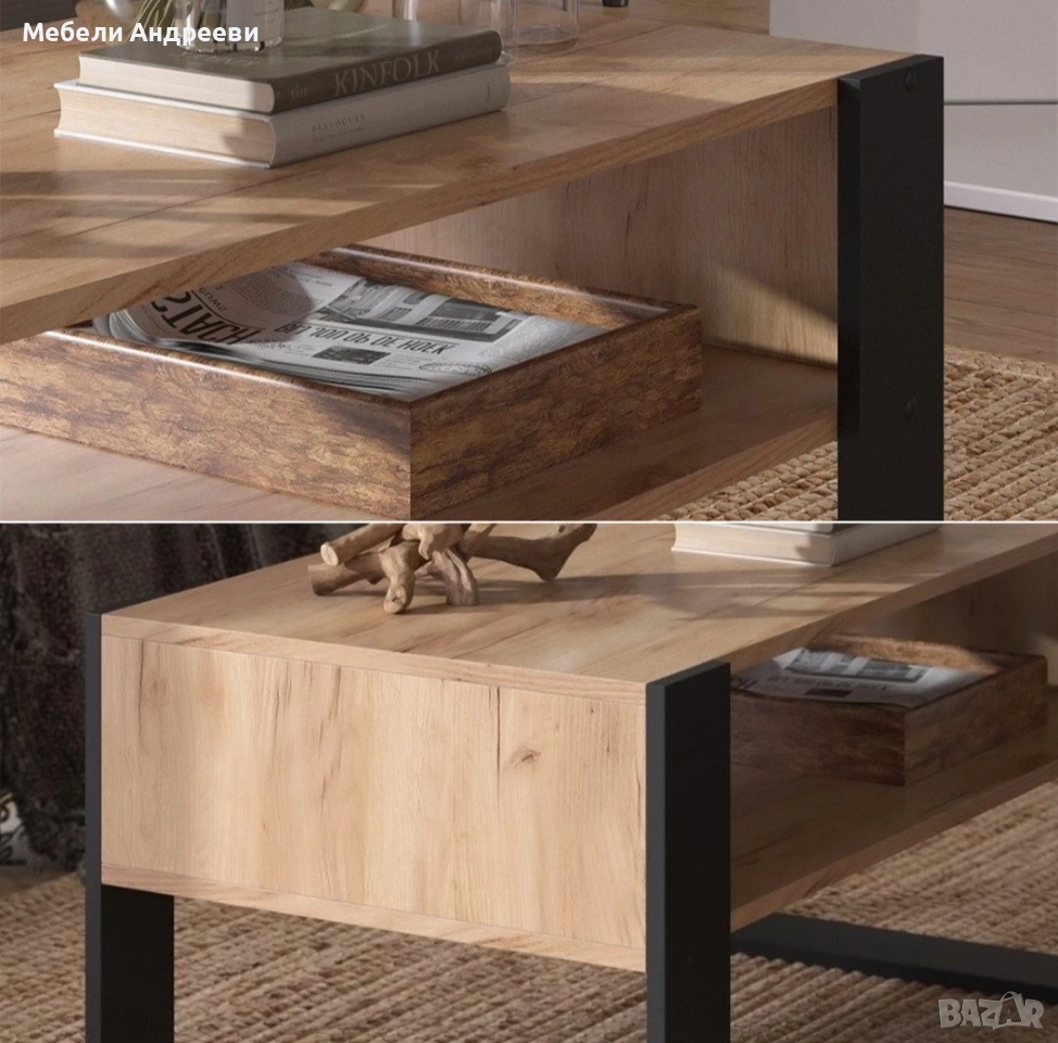 Холната маса е изработена от ПДЧ (16 мм) с меламиново покритие, подходящо за ежедневна употреба и лесно за поддръжка. Разполага с долна открита полица за списания, книги или аксесоари. Цветовата комбинация дървесен декор с черни елементи стои модерно и се съчетава лесно с различни интериори.
