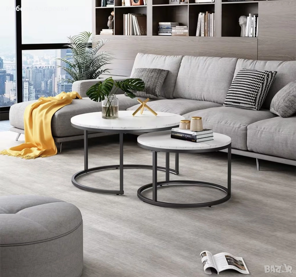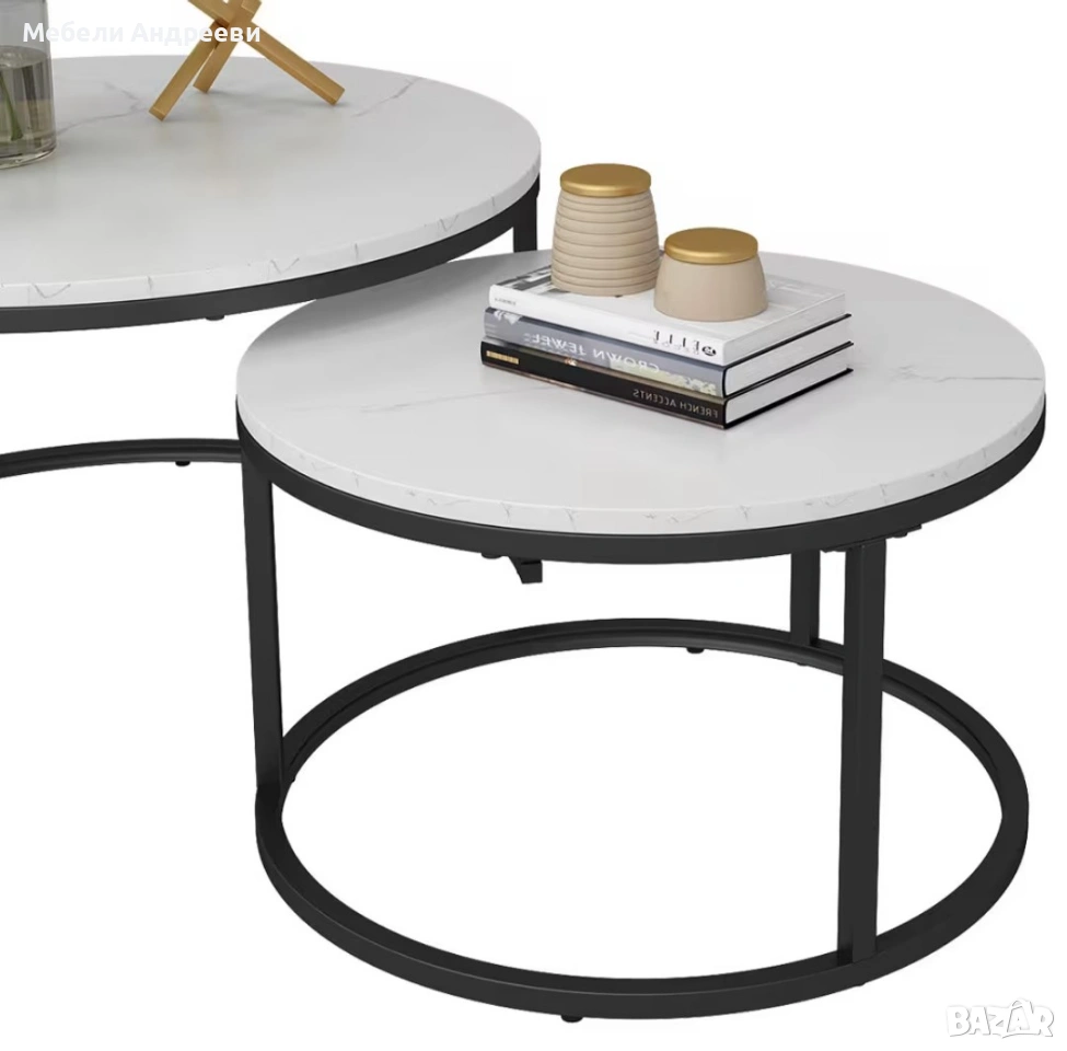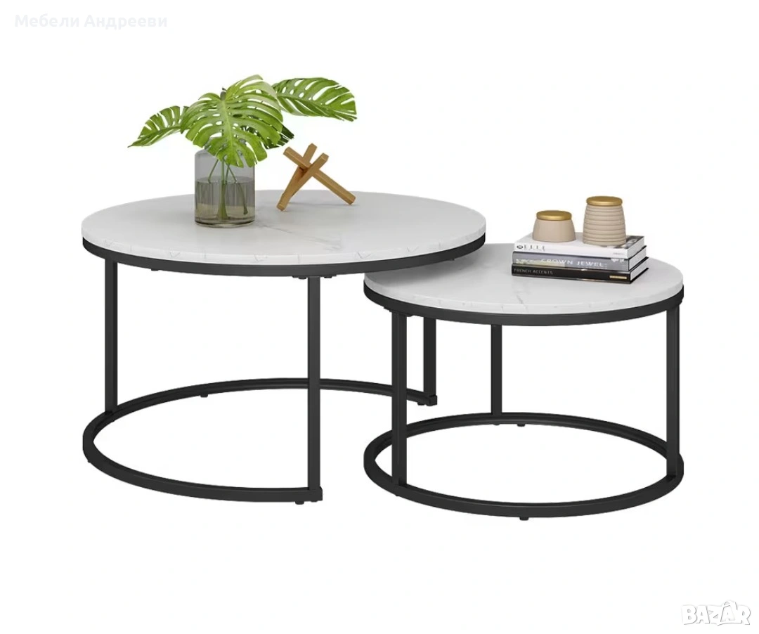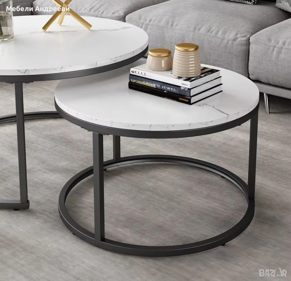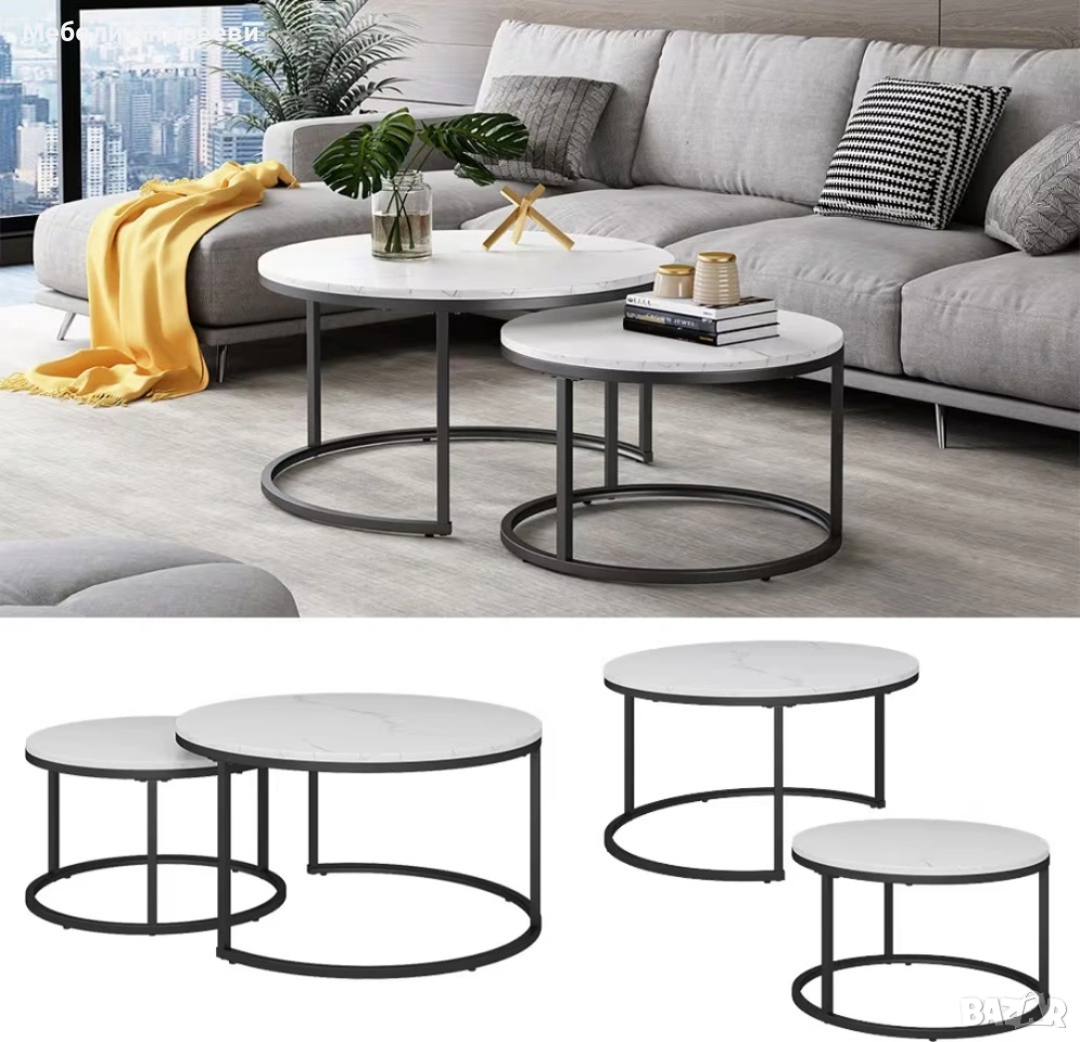 Комплектът включва две кръгли холни маси с метална конструкция и стабилни прахово боядисани метални крака. Плотовете са от ПДЧ с меламиново покритие в мраморен ефект. Двете маси могат да се използват поотделно или заедно като комплект, като едната се прибира частично под другата. Подходящи са за дневна, офис зона или като акцентно обзавеждане.