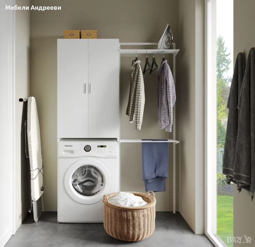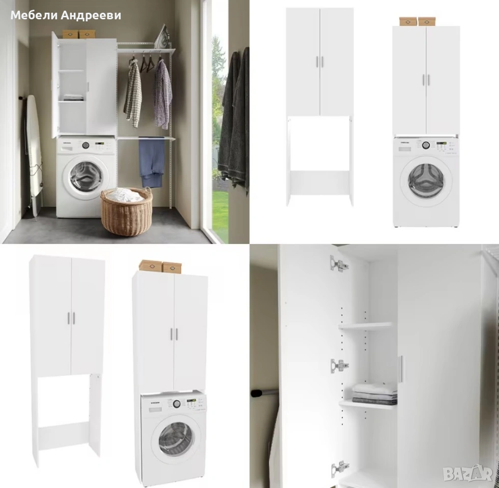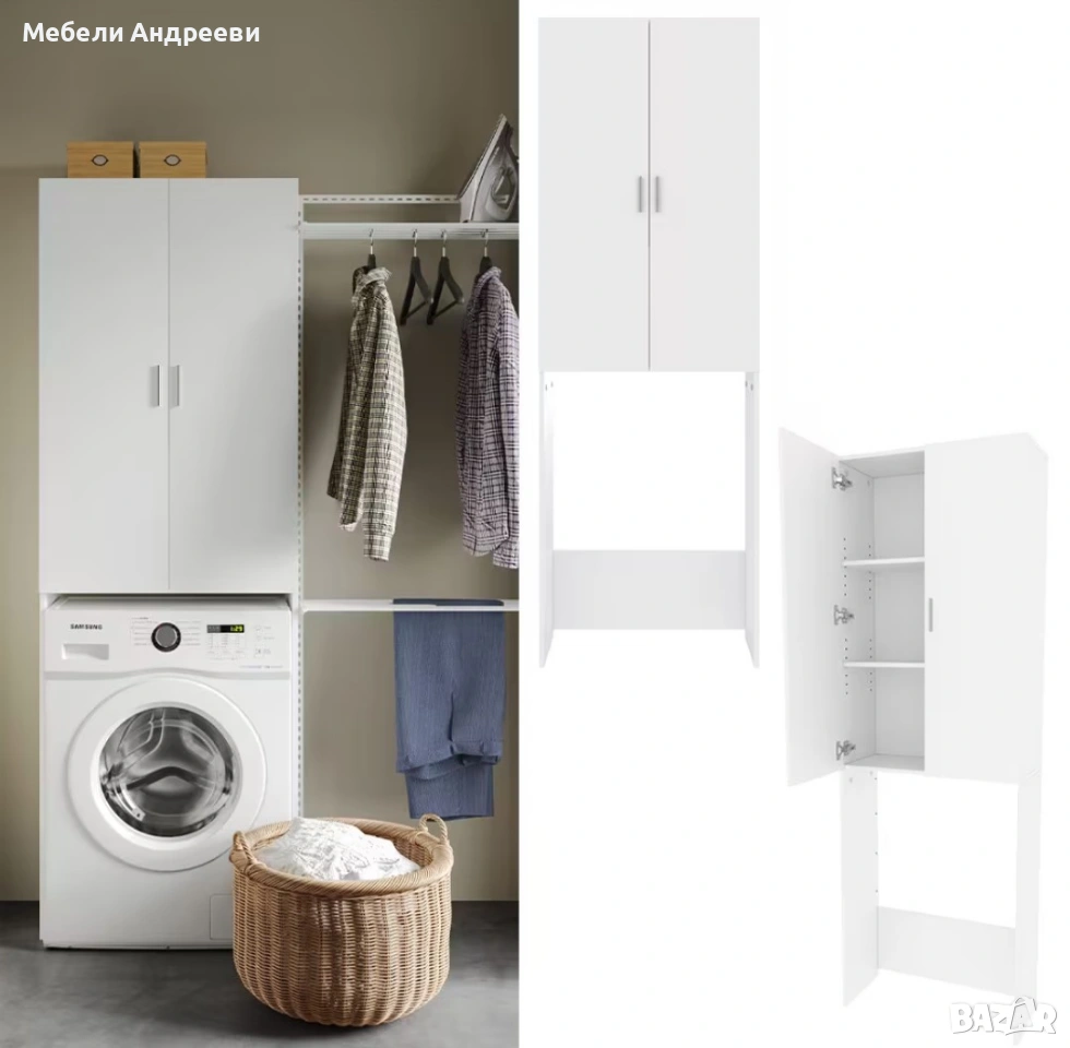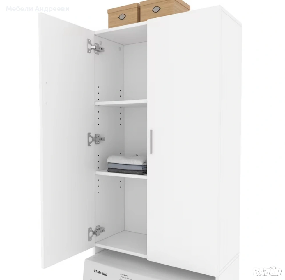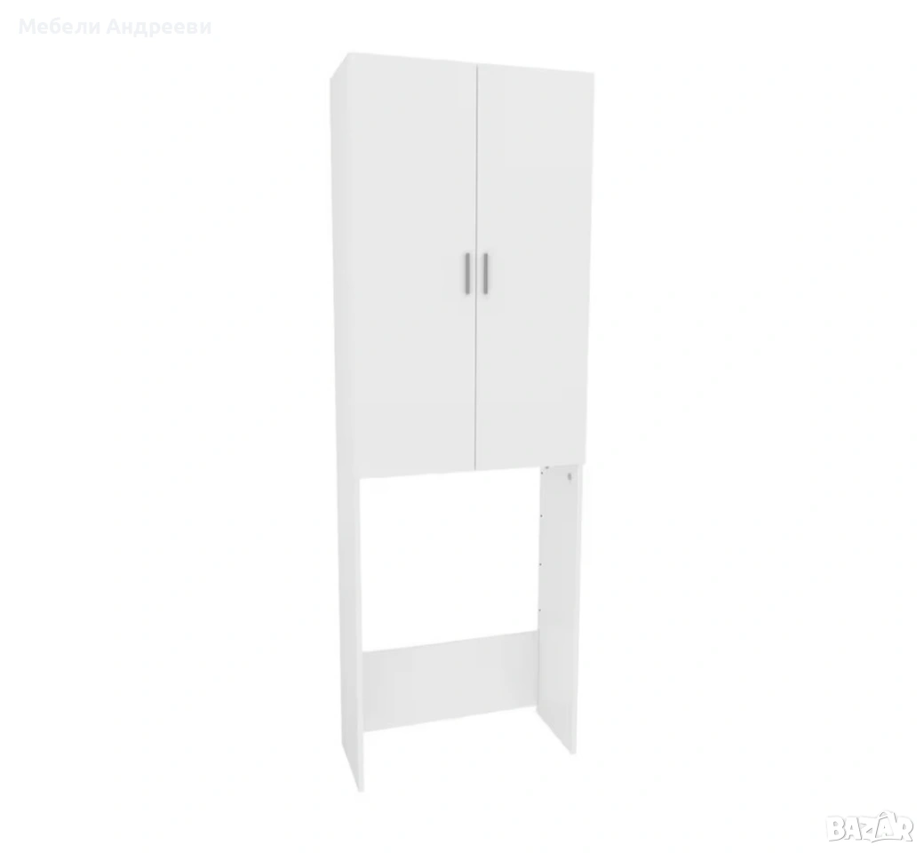 Шкафът е предназначен за монтаж над пералня или сушилня. Изработен е от ПДЧ с меламиново покритие, устойчиво на надраскване и влага. Разполага с две врати и регулируеми рафтове, подходящи за препарати, кърпи и ежедневни принадлежности. Идеално решение за баня, перално помещение или малки пространства, където всеки сантиметър е важен.