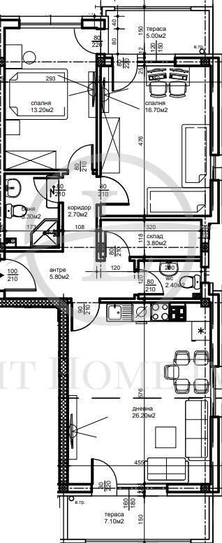 -Разпределение- Просторен хол с кухненски бокс, две големи спални, баня с тоалетна, тоалетна, склад, входно антре и две панорамни тераси.
