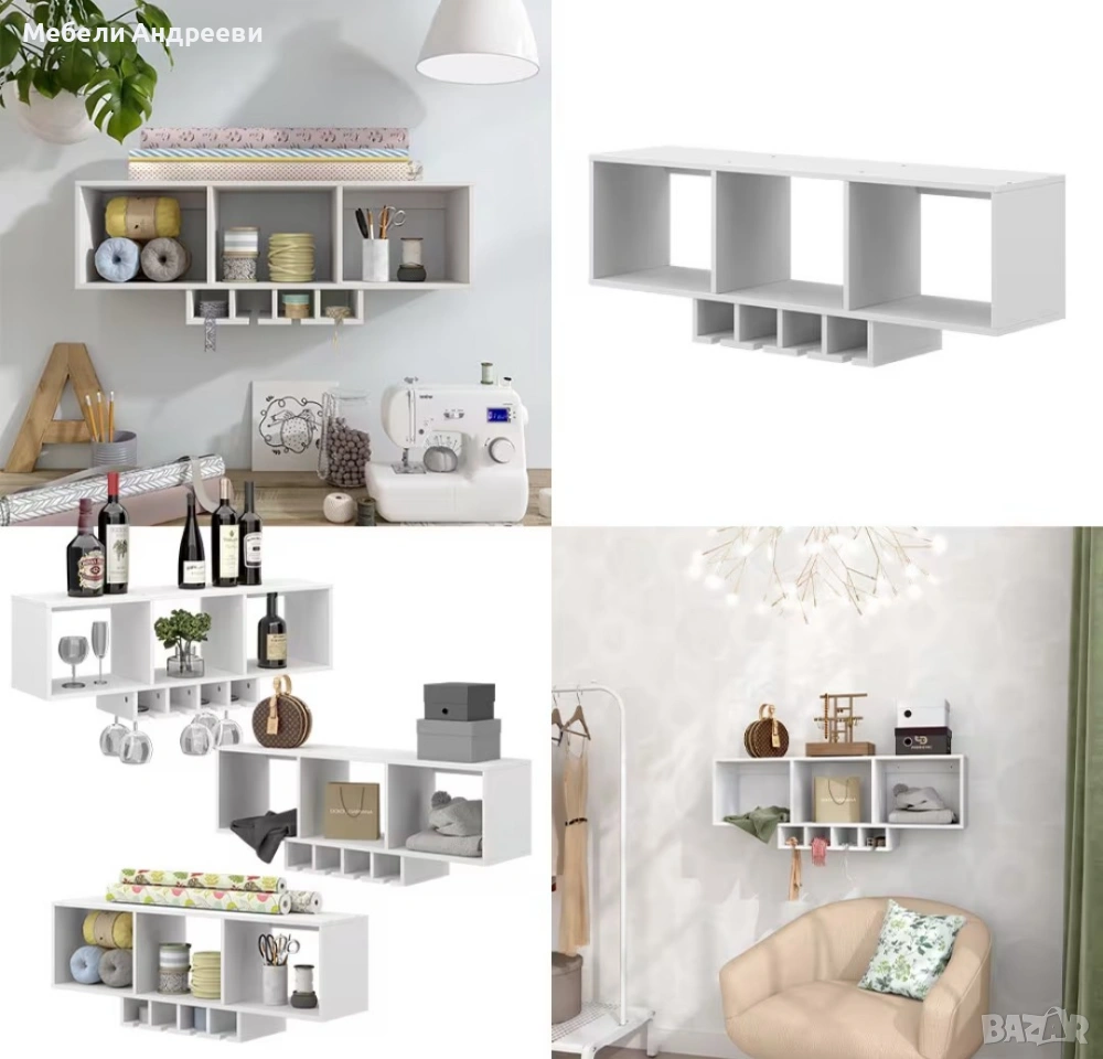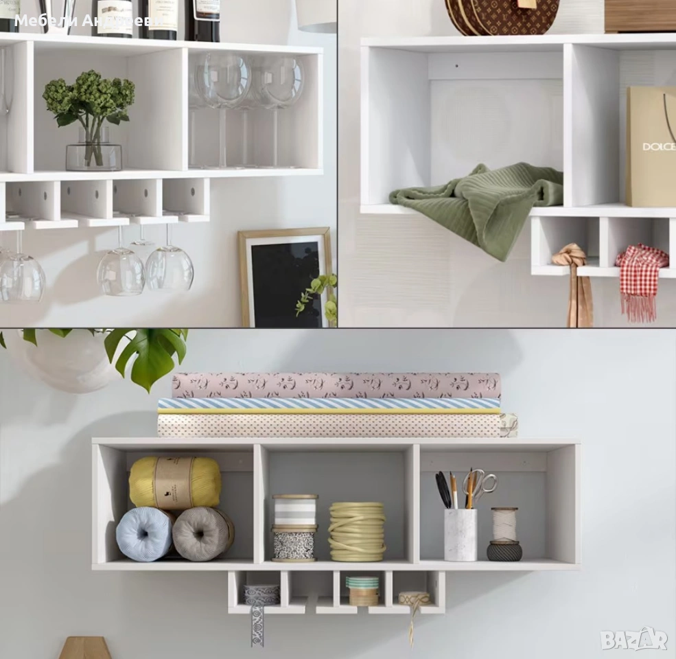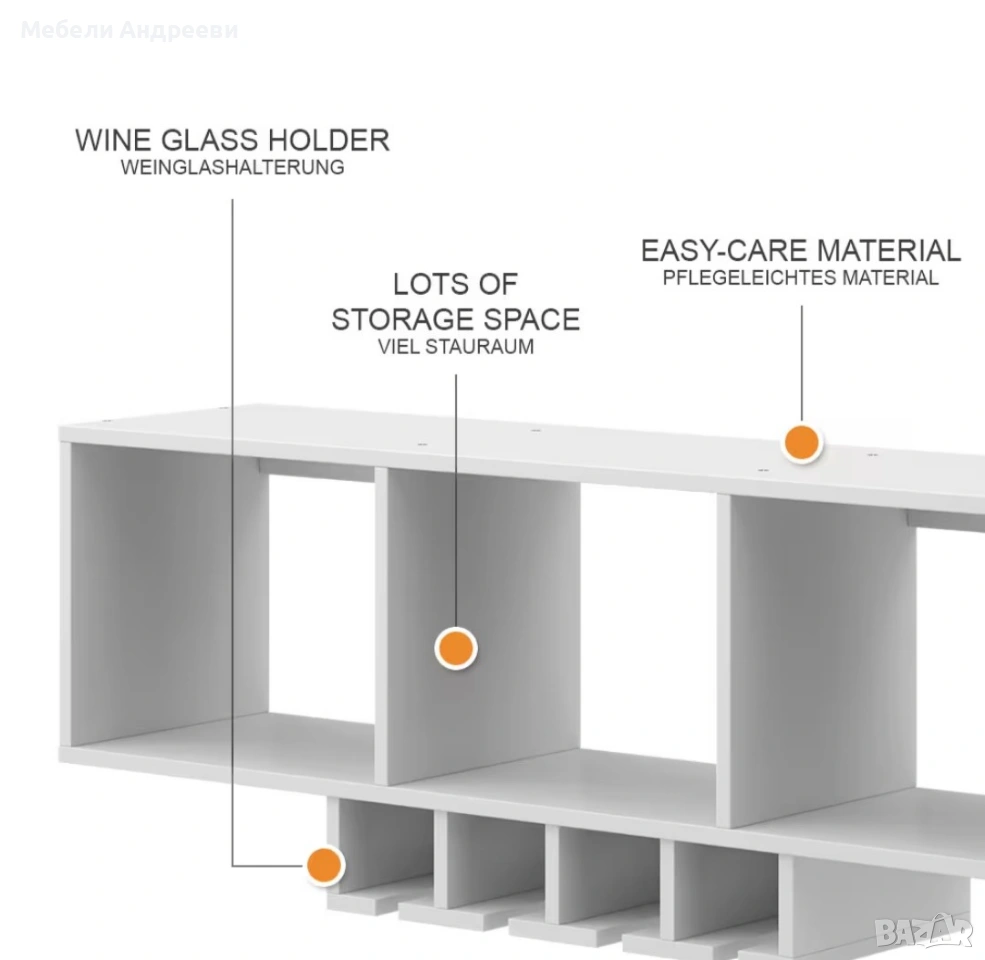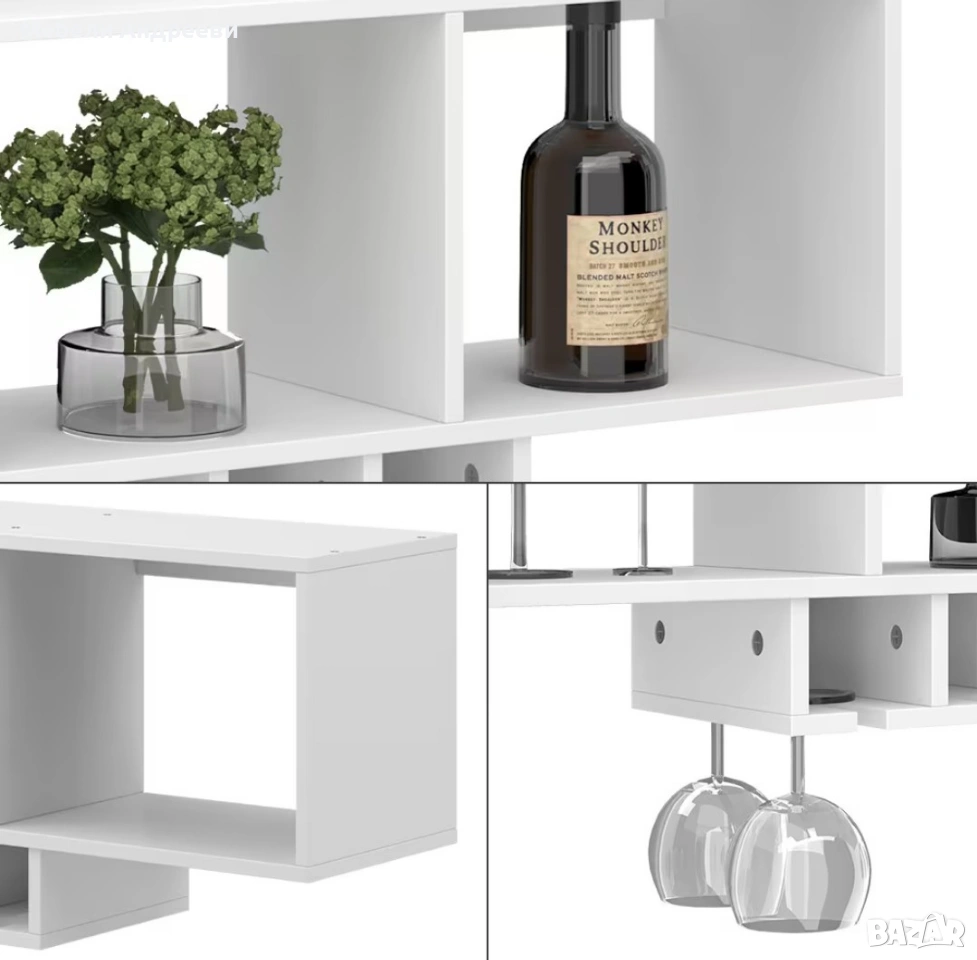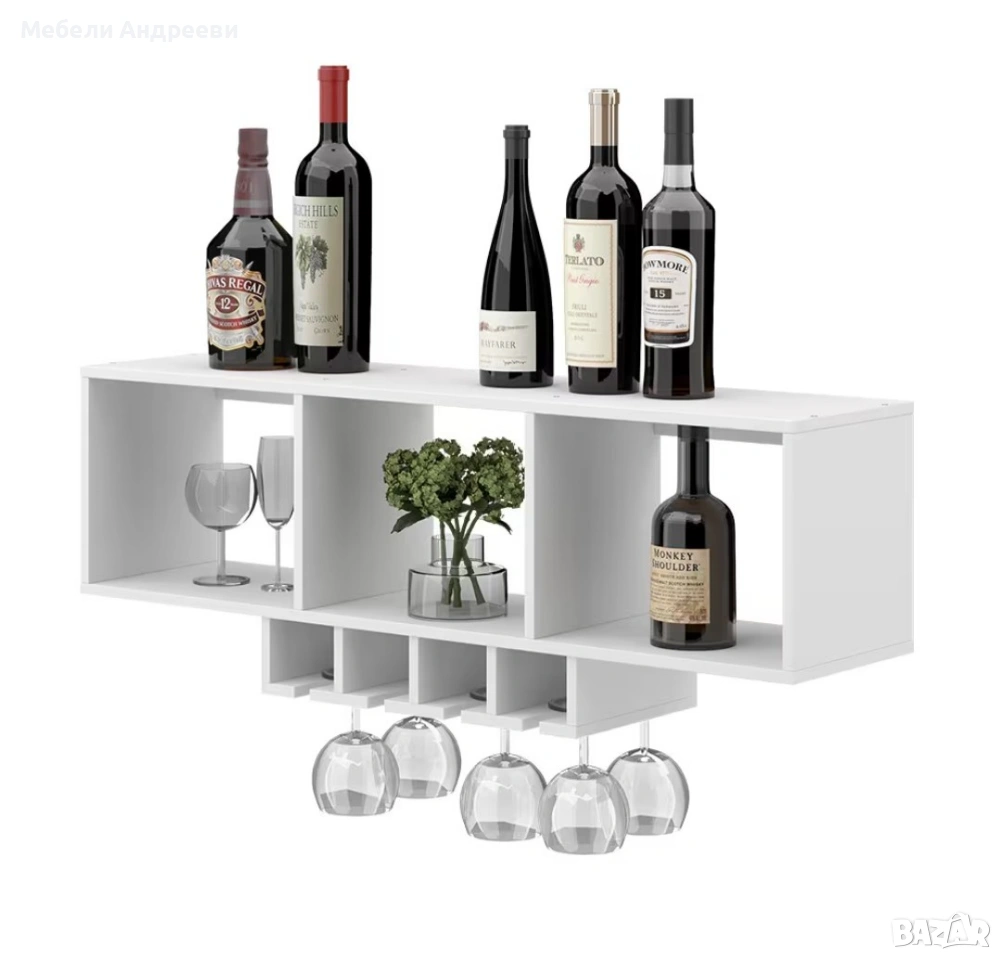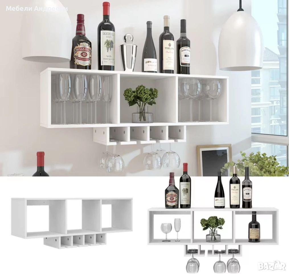 Стенното винено шкафче е изработено от ПДЧ с меламиново покритие, устойчиво на надраскване и лесно за поддръжка. Разполага с три основни отделения за бутилки и аксесоари, както и с долни релси за окачване на винени чаши. Подходящо е за кухня, трапезария или дневна и осигурява подредено и практично съхранение в стилна форма.