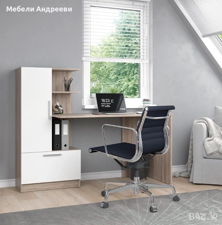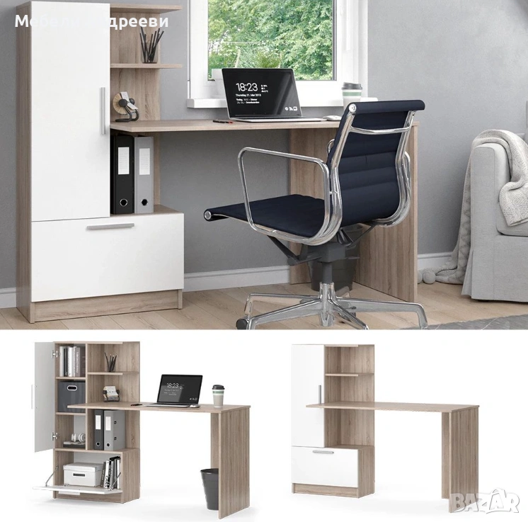 Това бюро е изработено от ПДЧ с меламиново покритие, устойчиво на надраскване и лесно за поддръжка. Разполага с практичен шкаф с вратичка, широк долен модул и два удобни рафта над плота. Конструкцията е стабилна, а комбинацията от светъл дървесен цвят и бяло се вписва във всяка стая.