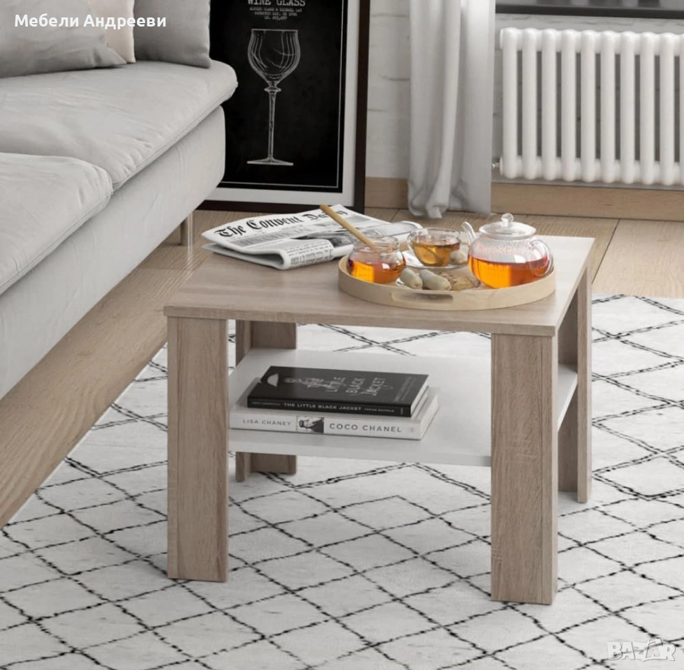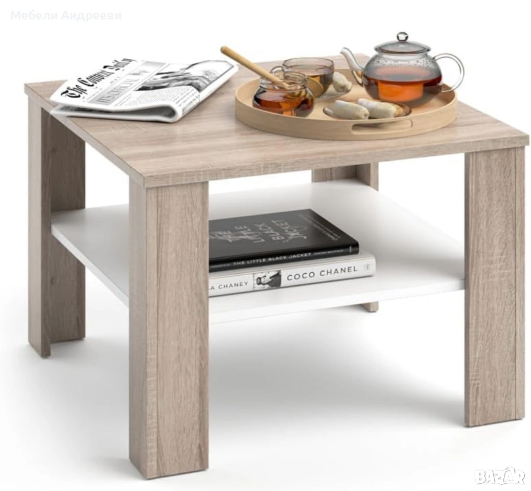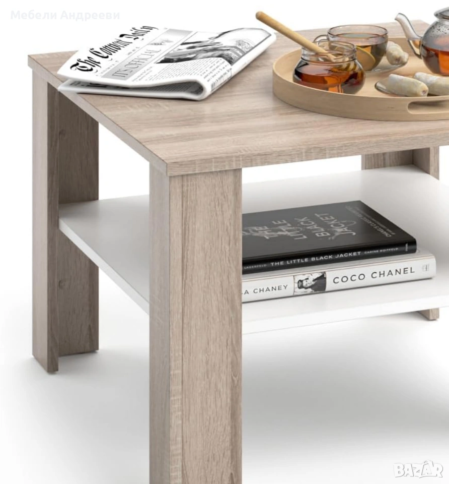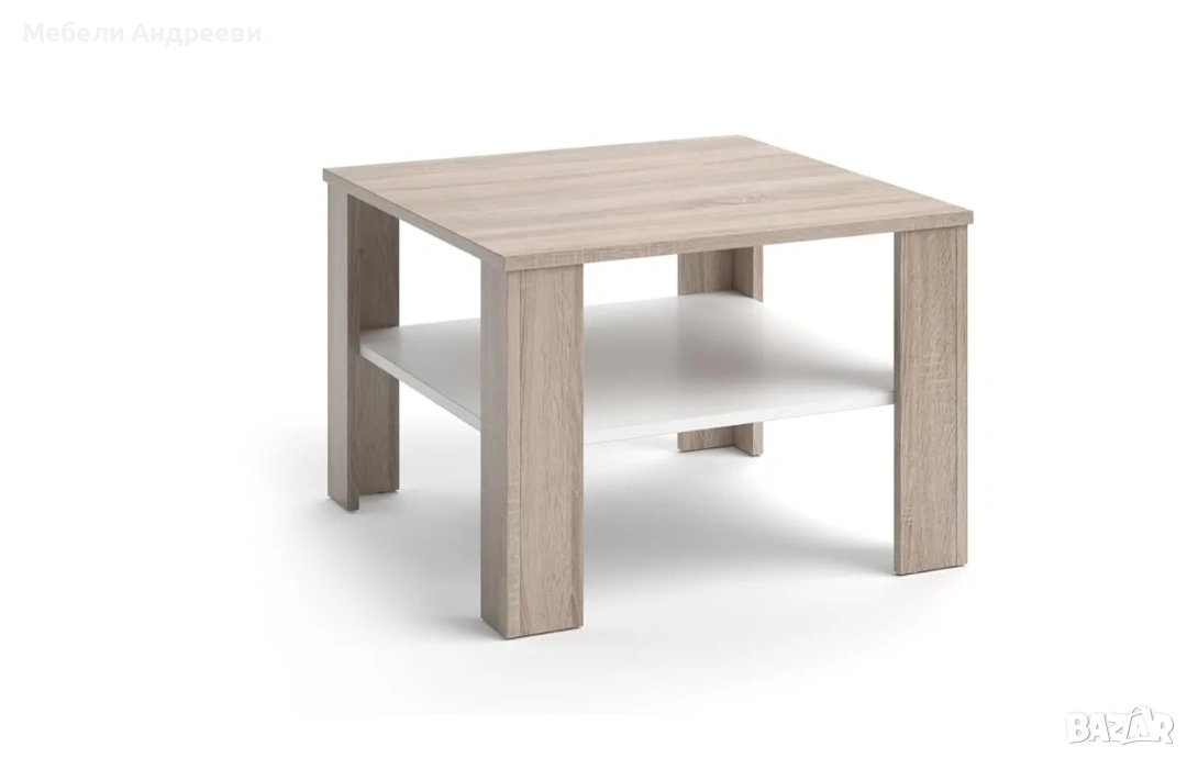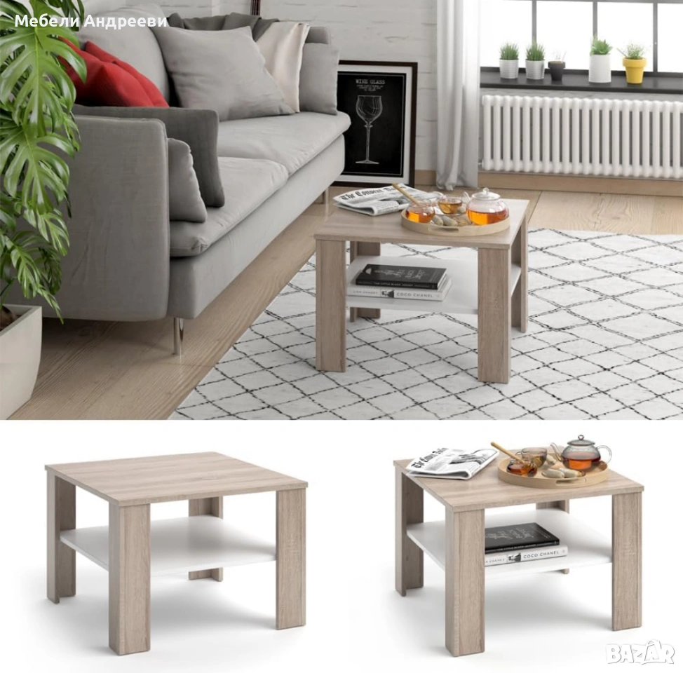 Тази холна маса е изработена от ПДЧ с меламиново покритие, устойчиво на надраскване и влага. Има стабилна квадратна конструкция и удобен долен рафт, подходящ за книги, декорации или дистанционни. Компактните ѝ размери я правят практично решение както за малки, така и за по-просторни дневни. Цветът „дъб“ стои модерно и лесно се комбинира с различни интериори.