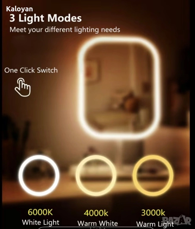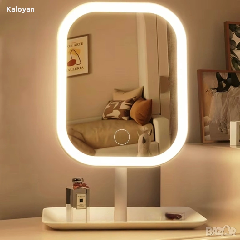 Огледало с LED осветление с тъч контрол,и с три типа светлини. Подходящо за спалня или гримьорна.Преносимо,компактен сгъваем дизайн.