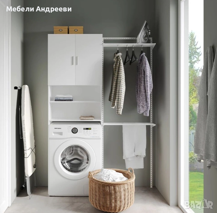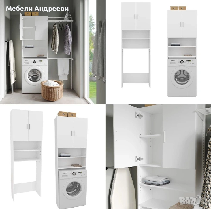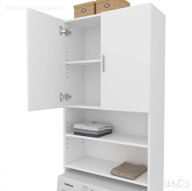 Шкафът е предназначен за поставяне над пералня и е изработен от ПДЧ с меламиново покритие – устойчиво и лесно за почистване. Горната част разполага с две вратички и вътрешно пространство за препарати, кърпи и аксесоари. Под тях има отворени рафтове за бърз достъп до често използвани вещи. Конструкцията позволява практично организиране на перално помещение, баня или сервизно пространство. Изчистеният бял цвят се комбинира лесно с всякакъв интериор и техника.