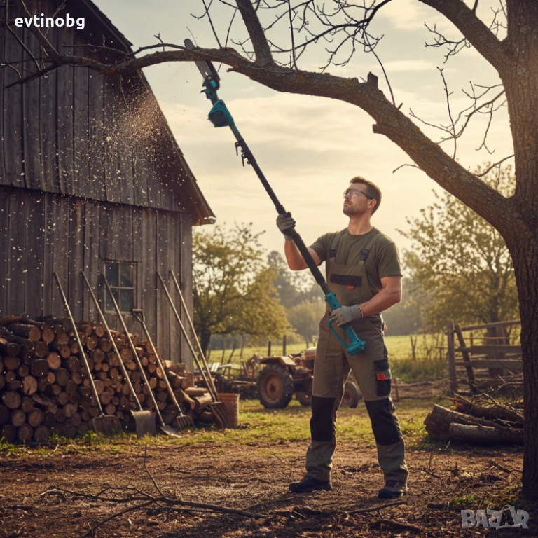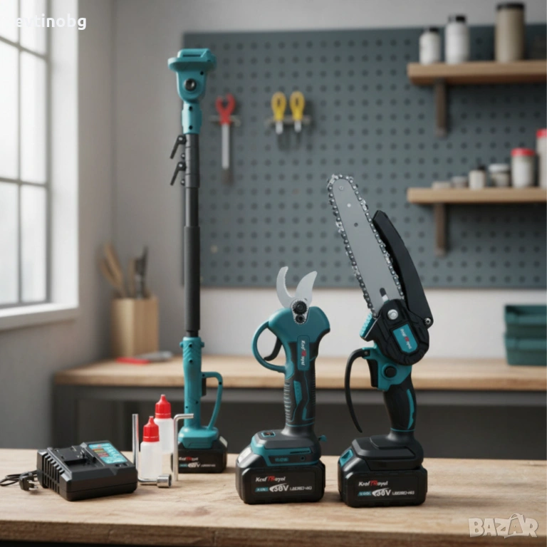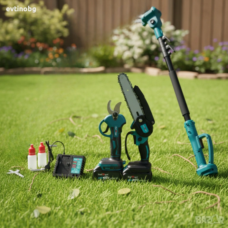 Комплект 3 в 1 от акумулаторна лозарска ножица, акумулаторен мини верижен трион и телескопичен прът