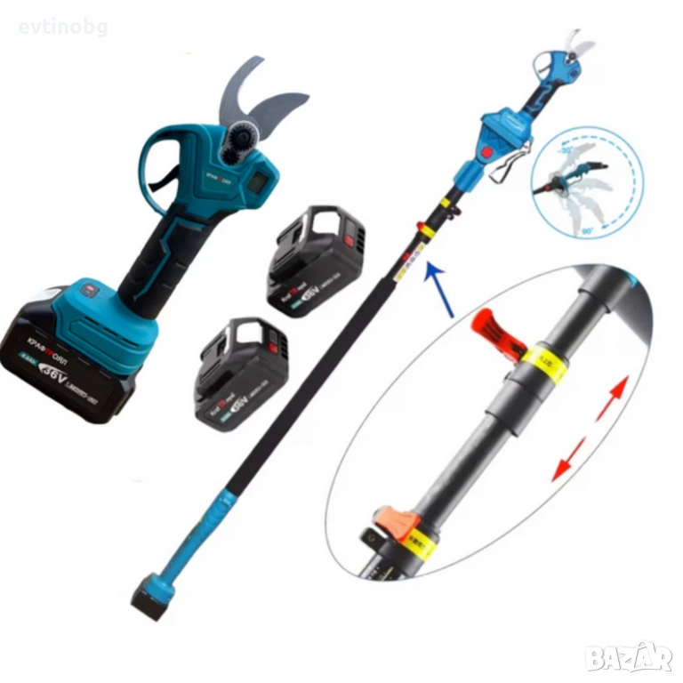 Акумулаторна лозарска ножица KraftRoyal 36V 8Ah с телескопичен прът до 2.7м — мощно, леко и удобно р