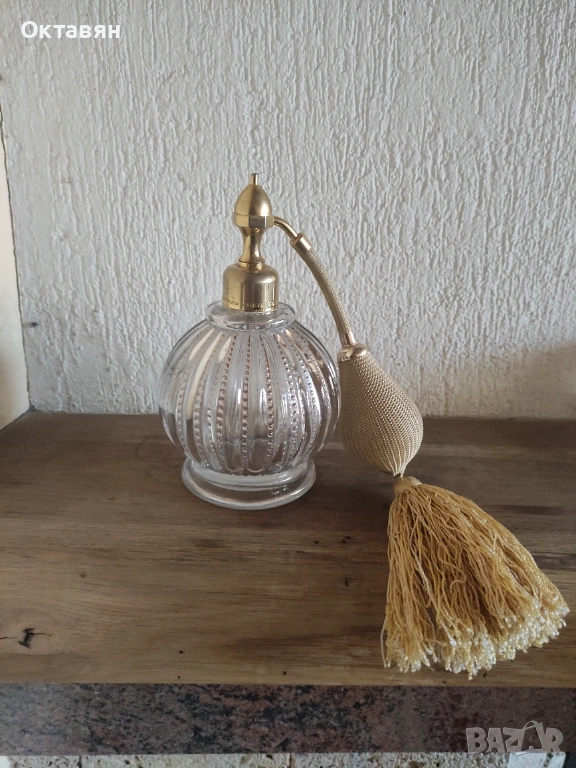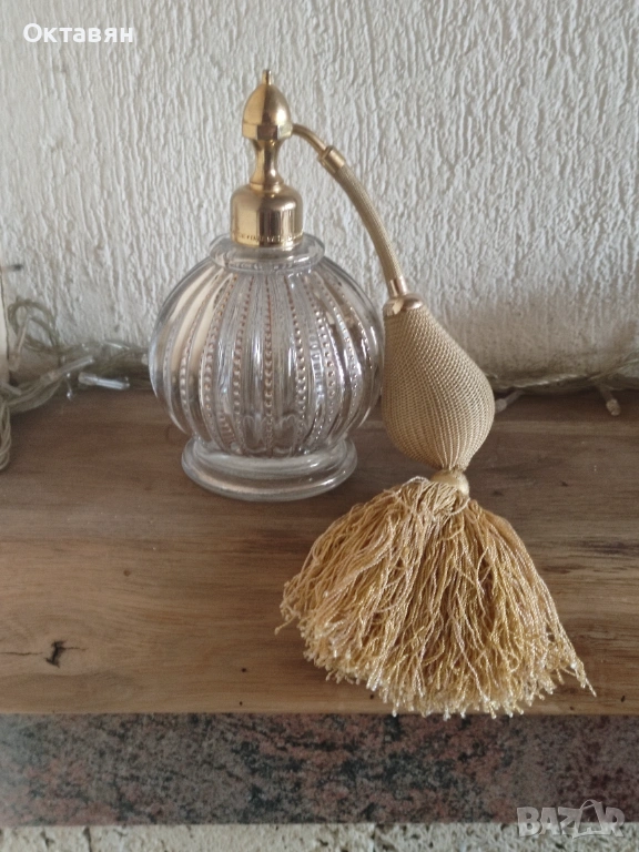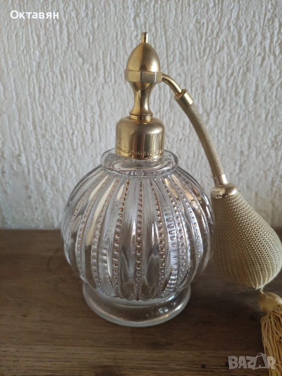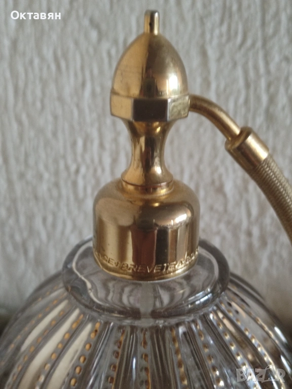 Винтидж колекционерски пулверизатор за парфюм с работеща помпичка на известната фирма- Marcel Franck. Бутилка е от тежко кристално стъкло с оребрени елементи, акцент със златни топчета и класическа помпичка с пискюл. Маркирана е с " France-Paris i Marcel Franck" на месинговата капачка и маркировка на дъното, произведена 1930-35 година. Състояние отлично, без драскотини ,напукване или чипове . Размери, височина- 15 см, диаметър на дъното- 7 см. По Еконт с 10% отстъпка от транспорта.