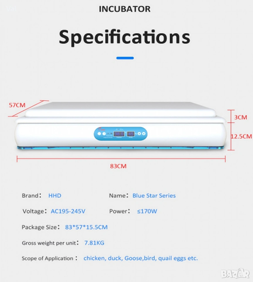 Капацитет: 120 яйца; Напрежение: 110V/220V; Мощност: 1530W (9 модула по 170W); Размери: 83 × 12.5 × 57 cm; Тегло: 7.81 кг; Материал на корпуса: Висококачествен ABS и термоустойчива пластмаса; Температурен диапазон: 30°C - 39.5°C; Точност на контрол на температурата: ±0.1°C; Контрол на влажността: Автоматичен; Дисплей: Цифров LCD дисплей за температура и влажност; Обръщане на яйцата: Автоматично на всеки 2 часа; Вентилатор: Вграден за равномерно разпределение на топлината; Овлажнител: Двойна система за контрол на влажността; Безопасност: Автоматично изключване при повреда на вентилатора; Система за разсейване на топлината: Да (защита от прегряване); Ниво на шум: ≤ 35dB; Сертификати: CE, FCC, ROHS; Възможност за свързване на допълнителни инкубатори.