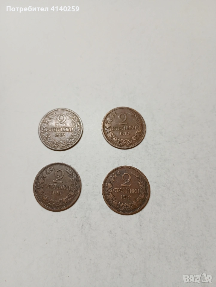 БЪЛГАРСКИ МОНЕТИ 2 СТОТИНКИ 1912 Г НЕЧИСТЕНИ ЦЕНА ЗА 4 БРОЯ СЪСТОЯНИЕ ВИДИМО ПОЛУЧАВАТЕ СНИМАНИТЕ МОНЕТИ РАЗГЛЕДАЙТЕ ДРУГИТЕ МИ ОБЯВИ ДА КОМБИНИРАТЕ ДОСТАВКА ЕКОНТ ЗА ВАРНА ЛИЧНО
