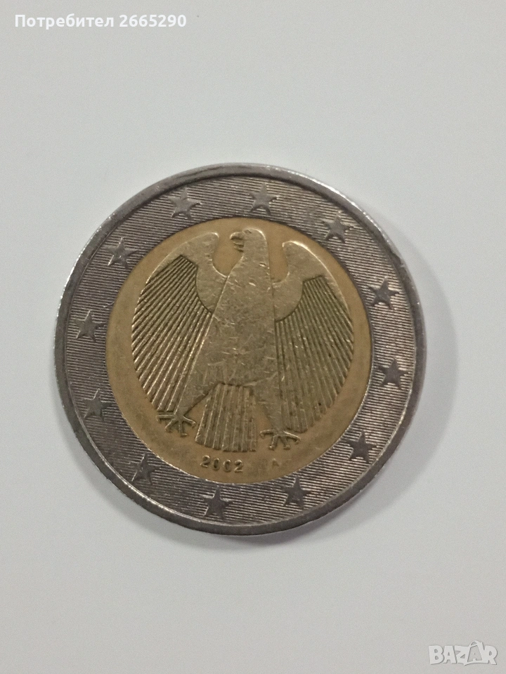 Продавам монета 2 евро Германия 2002 с фабрична грешка – завъртян вътрешен диск.