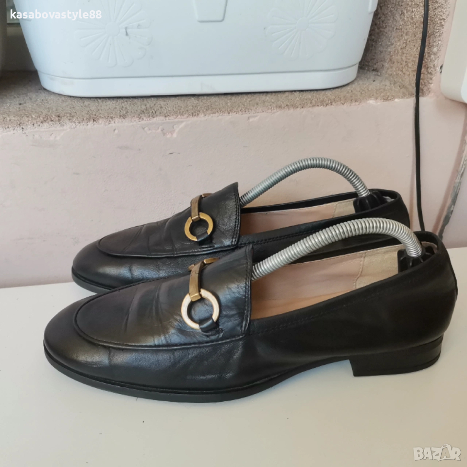 Дамски обувки тип мокасини в класически дизайн направени от гладка естествена кожа в черен цвят. Вътрешността е с много мека стелка, направена, цялостно от естествена кожа. Моделът е разнообразен с метални орнаменти в предната част. Ходилото е гъвкаво и комфортно. По етикет се водят 38 н но отговарят на 37. 5н Дължина на стелка 14.5см.Ходило 2см.Цялостна височина отзад 8см.