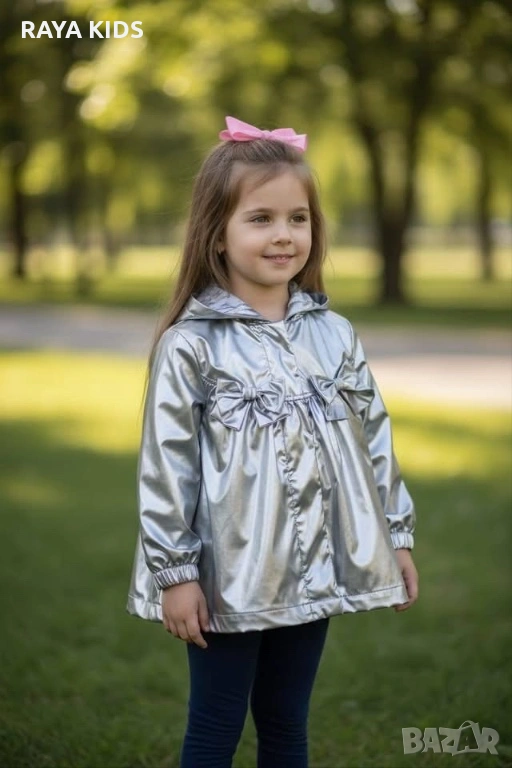 Пролетно яке за момичета от 2 до 6 години! Изработено от качествена материя, предпазваща от вятър и лек дъжд. Якето е с елегантна кройки и декорирано с нежни панделки.