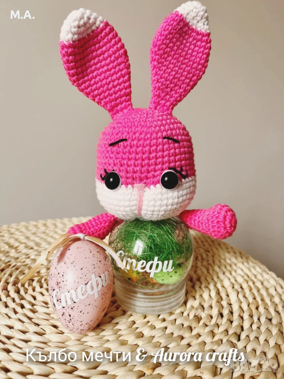 Зайчетата и пиленцата са ръчно изработени и монтирани върху пластмасово бурканче, което можете да напълните с бонбони, истинско яйце или каквото друго решите :)