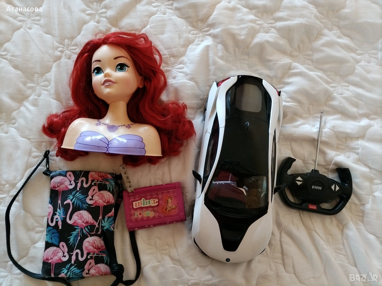 Продавам кола с дистанционно управление БМВ, вратите се отварят, има кутия и инструкции - 18 евро, глава за прически - косата е хубава и гъста - 10 евро, протмонето е 2 евро, чантичката с дръжка и цип - 3 евро. Запазени са, като нови.