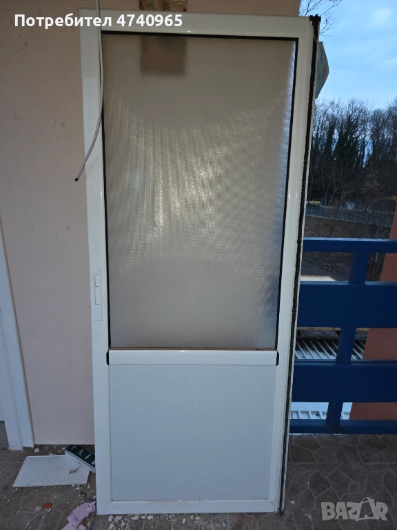 Използвани плъзгащи се врати, подходящи за разделяне на помещения или като декоративен елемент. Вратите са изработени от бял метален профил и матирано стъкло. Състоянието им е добро, с леки следи от употреба. Размерите на рамката са 193/140, вратата е 185/72.