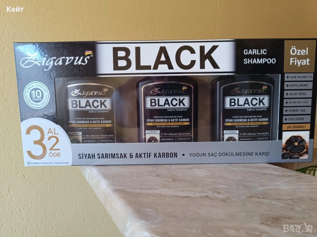 Против КОСОПАД Черният шампоан Zigavus (често наричан шампоан с черен чесън ) е продукт за грижа за косата от марката Zigavus. Той е предназначен главно за укрепване на косата и намаляване на косопада. Формулата на шампоана обикновено включва: