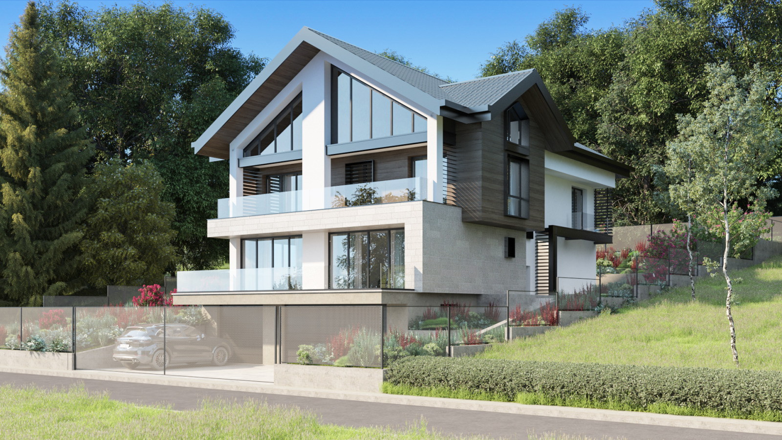 Къщата е с общо РЗП 695 кв.м., разположена в красиво озеленен двор от 719 кв.м., проектирана с внимание към детайла и удобството на модерния начин на живот.