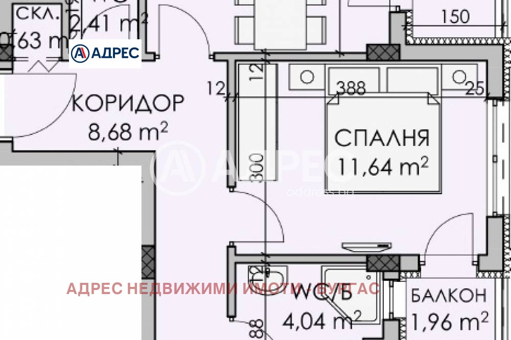 Площ на имота 104 кв. м., етаж 2 от 7, асансьор. Разпределение: дневна с кухненски кът и балкон, две спални /едната с балкон/, две бани с тоалетни и складово помещение. Изложение ЮГ.