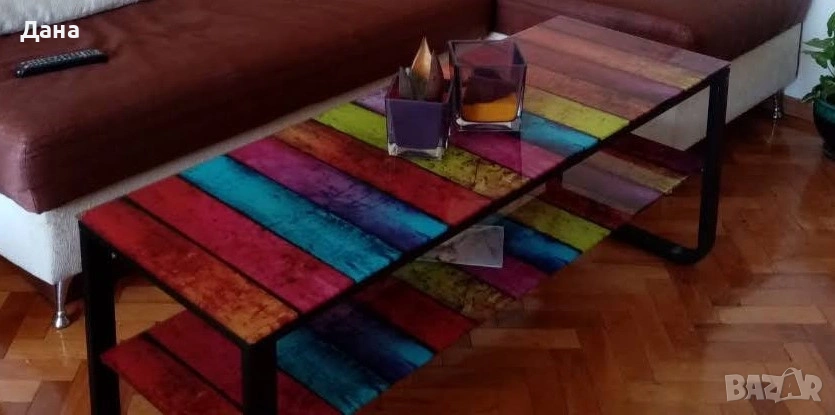 Оригинална и цветна, метални крака с два стъклени плота кафе масичка. Стъклената повърхност придава допълнителна елегантност на този уникален мебелен артикул.
