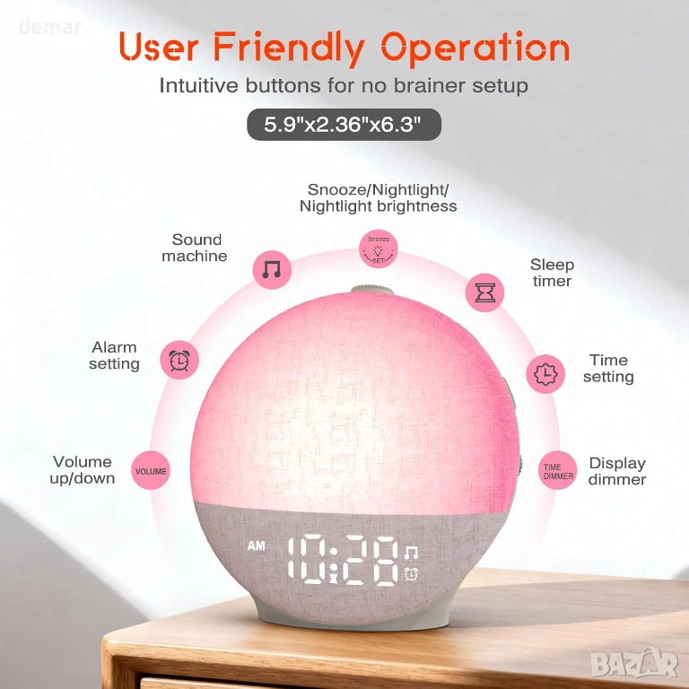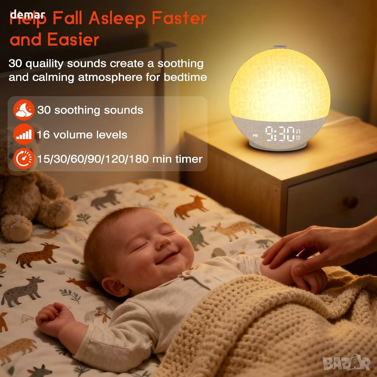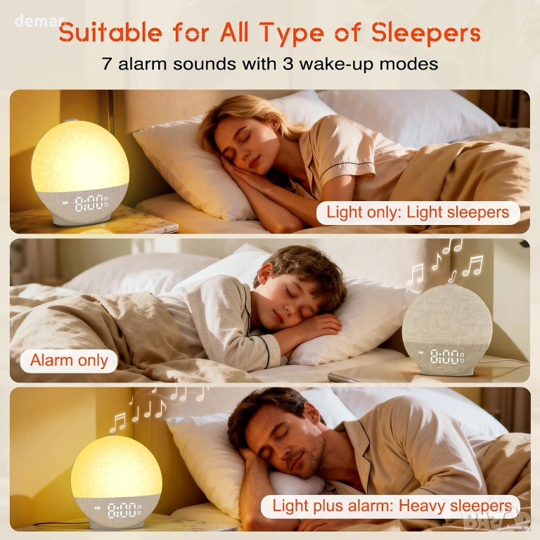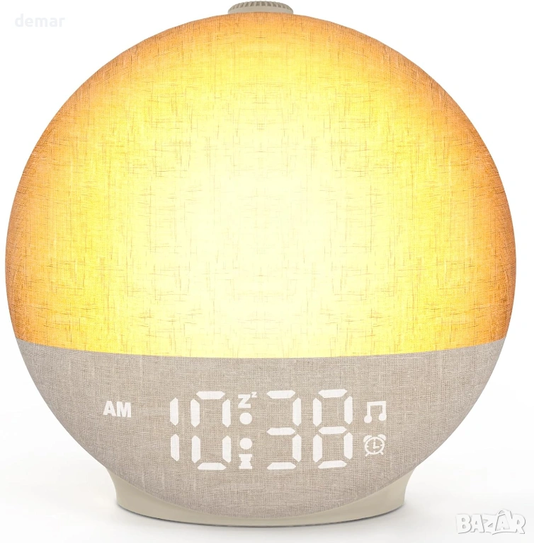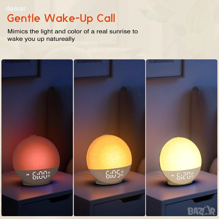 Будилник с изгрев, проектиран да ви събужда нежно с постепенна симулация на светлина, имитираща естествен изгрев, регулируем от 10 до 60 минути, за да ви помогне да започнете деня си освежени. Допълнителна звукова аларма с регулируема сила на звука до 110 dB и седем звука за събуждане, включително камбанки, песен на птици и мека музика, осигурява допълнителна надеждност за тези, които спят по-тежко, заедно с леснодостъпна функция за дрямка. Вграденият режим за залез постепенно затъмнява топлата светлина, за да подпомогне спокойното вечерно отпускане, докато 30 релаксиращи звука, като дъжд, океански вълни, гръмотевици и шум от вентилатор, помагат за маскиране на разсейващите фактори и насърчават спокоен сън. Таймерът за заспиване автоматично изключва звука и светлината след 15–180 минути. Яркостта на дисплея може да се регулира напълно, а лампата предлага 12 цвята с 20 нива на яркост, създавайки комфортна атмосфера за четене или релакс в спалнята.