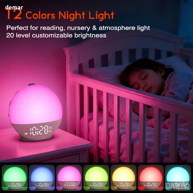 Будилник с изгрев/залез, машина за бял шум с 30 звука, 12 цвята, нощна светлина