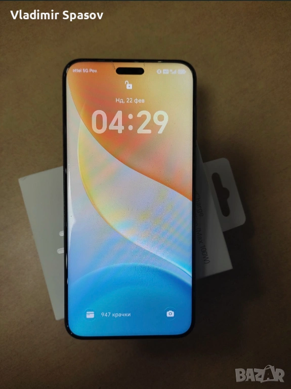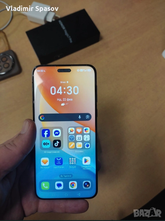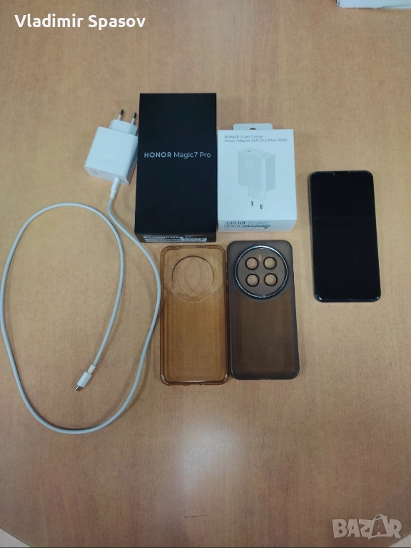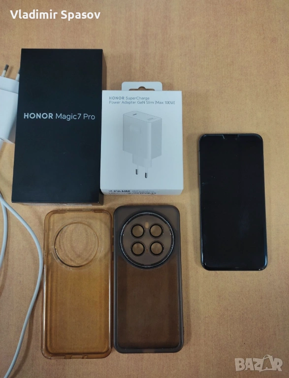 Продавам смартфон Honor Magic 7 Pro . Телефона в отлично състояние, с пълна окомплектовка – кутия, документи, зарядно и два кейса подарък,както и Протектор за камерите и нов стъклен протектор за дисплея .Устройството винаги е носено с кейс и е със заводския протектор на екрана. Дисплеят е без никакви забележки, а по корпуса има само минимални следи от кейса.
